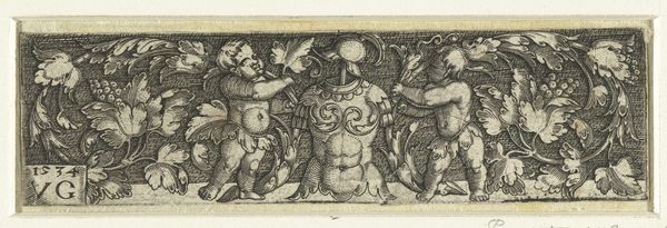 Curator: This delicate print, rendered in the old engraving style, comes to us from Heinrich Aldegrever in 1539. The Rijksmuseum aptly titles it “Frieze with a Bust, Foliage and Two Children." I see it as a charming vignette, full of unexpected combinations. Editor: It’s lovely, there's almost an ancient, slightly irreverent feel. But are they really children or are they plump cherubs? It is not easy to discern their true nature from the image. They seem plucked straight from a fever dream—playing amidst stern portraits and lush, drooping flora. Curator: It's Northern Renaissance decorative art at its finest! Prints like these weren't just decoration; they served as models for artisans. Think metalworkers, furniture makers—whoever needed fresh design ideas. This composition, figuration tangled in foliage, would give them something classical yet playfully original to work with. Editor: Ah, that explains the odd juxtaposition! So, imagine a serious craftsman trying to reproduce these mischievous cherubs, these chubby, grappling cherubs for... say a goblet? Do we know for whom the craftsman designed his art? For the Church, for a monarch, or just to serve the needs of their own creative process? Curator: We can only speculate but such decorations during the renaissance found wide applications: books, tapestries, building ornamentations for an aristocratic, educated public—all reflecting a culture of increased aestheticism. What’s captivating is how Aldegrever blends sobriety, with that serious-looking bust in the center, with such frivolous joy. Editor: You are correct; that tension holds my attention! It is as if the artist wants to convey an eternal truth through light touches, but there remains a certain weight nonetheless. It gives me a bit of hope—art surviving with hints and mysteries—which seems right. Curator: Absolutely! That sense of survival, and translation, resonates deeply. A quiet commentary on cultural resilience. Editor: I'll carry this little burst of contained joy with me. Thanks for unraveling a little of its enigma!