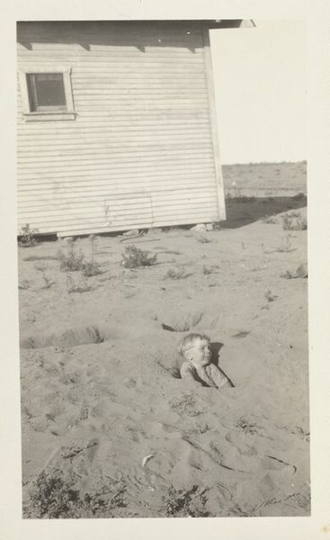 This small, undated photograph presents a study in contrasts: the rigid geometry of a building against the organic forms of a beach landscape. The composition centers on a pair of boy’s feet emerging from the sand, an intimate detail set within a vast, undefined space. The photographer, though unknown, plays with scale and perspective, creating a dialogue between the foreground and background. The stark lines of the building offer a structured counterpoint to the fluid, almost amorphous quality of the sand and distant horizon. This interplay between the constructed and the natural destabilizes our conventional understanding of space. Is the boy buried, playing, or simply disappearing? The photograph invites us to question fixed meanings, presenting an image that is at once playful and unsettling. The lack of context encourages an ongoing interpretation of the visual and cultural codes embedded within.