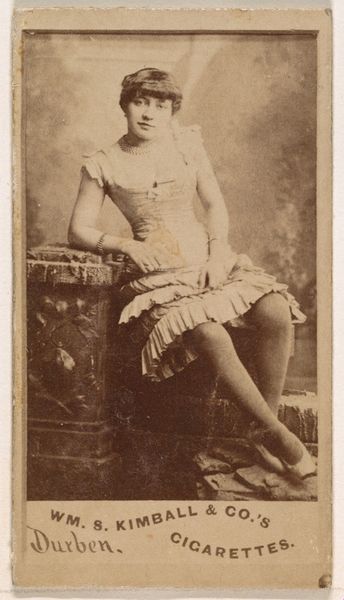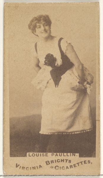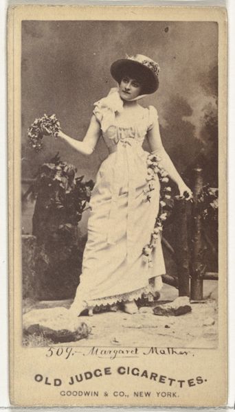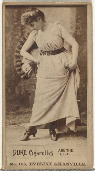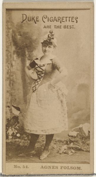 This is 'West,' a photographic print made by Allen and Ginter for Virginia Brights Cigarettes. It’s part of a series called 'Actors and Actresses,' reflecting the growing celebrity culture of the late 19th century in the United States. These cards were distributed with cigarette packs, using popular figures to promote smoking. It's a fascinating example of how commercial interests co-opted the burgeoning entertainment industry. Actresses like West gained visibility, but within a framework that prioritized consumerism. The image's visual codes – her costume, pose, and the exotic backdrop – create an alluring spectacle. Understanding this image requires exploring the cultural norms around entertainment, advertising, and gender roles of the time. We can consult theater programs, advertisements, and social commentaries to unpack its meaning. Ultimately, 'West' reminds us that art and popular culture are always embedded in specific social and institutional contexts.