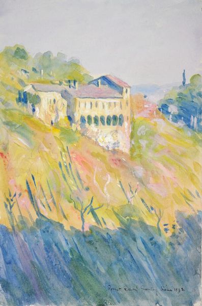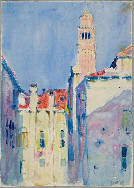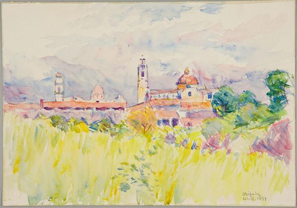 Editor: This is "Orizaba, Mexico" by Denman Waldo Ross, housed at the Harvard Art Museums. It's a watercolor piece, and the layering of colors creates a hazy, dreamlike impression. What compositional elements strike you most? Curator: The structure is compelling. Ross employs a high vantage point, organizing the composition into distinct planes. Note how the architecture in the mid-ground anchors the composition with its geometric solidity, contrasting with the organic forms of the foliage. Editor: So, the interplay of geometric and organic shapes is key? Curator: Precisely. The facade in the foreground with its linear balustrade leads the eye toward the domed church. It's a visual dialogue that underscores the relationship between man-made structures and the natural landscape. Editor: I see it now! Thanks for pointing out those relationships. Curator: Indeed, analyzing these formal elements enhances our appreciation.