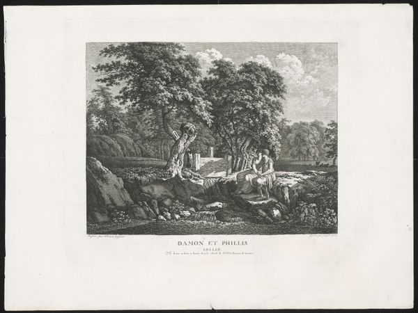 Editor: Carl Wilhelm Kolbe's "Damon and Phyllis, An Idyll" presents a serene scene. I'm struck by the delicate detail of the engraving, it almost feels like a memory. What enduring themes do you see reflected in this work? Curator: The figures of Damon and Phyllis, often associated with pastoral poetry, evoke a longing for a simpler, perhaps imagined, past. Do you see how the natural setting, rendered with such meticulous detail, contributes to that feeling? Editor: Yes, the trees and water seem to frame the figures almost protectively. So, nature is not just a backdrop, but integral to the narrative. Curator: Precisely. It embodies the cultural memory of Arcadia, a symbol of harmony. The image taps into our collective yearning for unspoiled nature and innocent love, doesn't it? Editor: It does. Seeing it as a cultural memory makes me appreciate the symbolic weight carried by seemingly simple images. Curator: Indeed. The persistence of these symbols allows art to speak across centuries, reminding us of our shared human experiences.