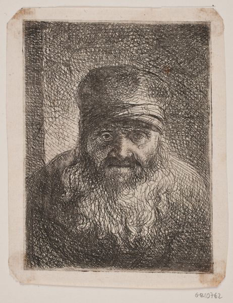 Curator: So, here we have Rembrandt van Rijn's etching, "Bearded Man with Short Wavy Hair: Bust," dating back to around 1631. What springs to mind for you when you look at this piece? Editor: Melancholy. The heavy shadows cast across his face and that downward gaze—it’s undeniably somber. There’s a gravity here that pulls you in. Curator: I see what you mean. He definitely seems lost in thought, or maybe just tired. But I also find it intensely intimate. Rembrandt's known for capturing the human soul in his portraits, and this feels like a particularly honest glimpse into someone’s inner world. It's so simple, just an etching, but so profound. Editor: Precisely. And let's think about the socio-political context. 1631…The Dutch Golden Age. What does it mean to depict a possibly marginalized, older man when Dutch art was so focused on merchants and opulence? Is this Rembrandt making a subtle commentary about class? Curator: Ooh, good point. It’s fascinating to think about it as a potential counter-narrative to the mainstream art of the era. Or, maybe, he's simply drawn to the textures and character in his face? You know Rembrandt; sometimes it's all about the light. Editor: It could be. The limited contrast definitely draws your eye into all those gorgeous details in the lines and shading. I think the tension between light and shadow highlights a certain realism and perhaps reveals an unidealized vision of masculinity during the Baroque. Curator: He really lets us see the weight of his years in those lines. The short, wavy hair under the cap, that amazing beard… and he still looks dignified somehow. This, even as a "print," has such striking physical presence, it still blows my mind that something etched in acid could convey this level of intimacy. Editor: It really showcases how an artist’s empathy can be channeled into a piece. I agree, his dignity is not just apparent, but powerful. It is an older man holding his own in a young nation’s art world. The way the light graces his face, despite everything, hints at the resilience of his spirit, a mirror to Rembrandt’s genius, no? Curator: Exactly, and maybe a bit of both of their spirits, intertwined on this copper plate. It is quite special, thinking about how his personal sketch speaks even today, centuries later! Editor: Yes, a quiet reflection to spark dialogue about time, aging, and being. What a privilege to experience such vulnerability frozen in art.