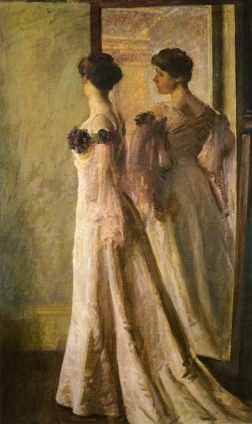 Editor: Thomas Anshutz's "A Passing Glance," painted around 1900 using oil paint, depicts a woman looking at herself in a mirror. There's something really intimate about it, like we're intruding on a private moment of reflection. What's your interpretation of this work? Curator: It's interesting that you see it as intimate. I agree, but I also think it prompts questions about the construction of female identity and the male gaze. Anshutz, a male artist, is representing a woman viewing herself, which creates layers of interpretation. How complicit is he in the objectification he’s ostensibly observing? Does the soft, impressionistic style mitigate that tension, or heighten it? Editor: I hadn't considered it in terms of the male gaze. So, you're saying the act of a male artist painting a woman looking at herself becomes inherently political? Curator: In many ways, yes. The history of art is rife with depictions of women seen through a male lens. When a woman is depicted looking at herself, it opens up questions of agency. Is she truly seeing herself, or is she seeing a reflection of societal expectations and ideals imposed upon her? Does the painting serve to celebrate or critique this dynamic? Editor: That makes me think about how much context influences our viewing experience. A painting like this might have been read completely differently a hundred years ago. Curator: Exactly! And understanding the power structures inherent in art history is crucial to critically engaging with works like "A Passing Glance." We need to analyze it in the context of gender politics and consider who is controlling the narrative, both within the painting and outside of it. What do you take away now? Editor: It is definitely less simple and straightforward now! It's fascinating to realize how many layers of meaning can be packed into what seems like a quiet, personal scene. I now see that it is more about the artist portraying not only her self image but of his own construction of womanhood, in both art and society at large. Curator: Indeed. Questioning those assumptions is exactly the point of view art historians should be considering.