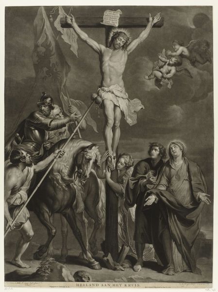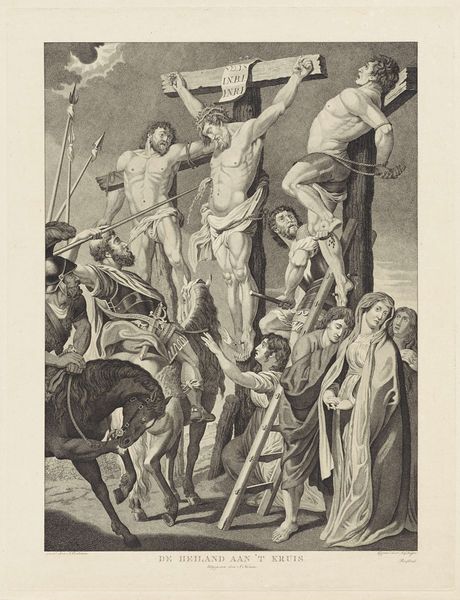Editor: We are looking at Rembrandt van Rijn's "The Descent from the Cross: Second Plate" at the Harvard Art Museums. The stark contrast creates an emotionally charged scene. What symbols or historical context do you see reflected here? Curator: Note how the descending body, illuminated, becomes a symbol of sacrifice but also vulnerability. Consider, too, the ladder—a recurring motif for spiritual ascent and descent. Doesn't it remind you of Jacob's Ladder, linking heaven and earth? Editor: That's a great connection! It deepens the piece's emotional and religious impact. Curator: Exactly! These visual echoes reinforce the artwork’s layered meaning, linking individual suffering to collective memory.