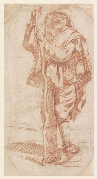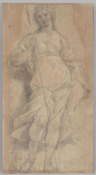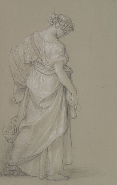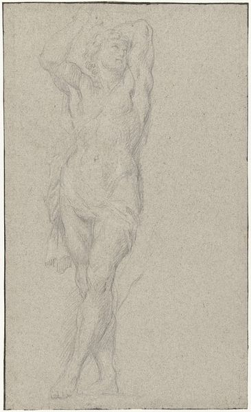 Curator: This drawing, "Studie van een staande figuur," is attributed to Benedetto Luti and was created sometime between 1676 and 1724. It’s a study, done in pencil on paper. What strikes you first? Editor: The dynamism. It feels like she’s either about to take flight or collapsing, you know? It's teetering on that edge, all swirling fabric and uncertain balance. Makes you wonder what drama is unfolding, even in just a quick sketch. Curator: Indeed. Notice how Luti uses line weight to suggest form and movement, a common trait among Italian Renaissance artists? The flowing drapery is quite typical—a classical trope referencing status. In classical figurative artwork, the folds denote the cultural and/or symbolic identity and moral character. Editor: The paper tone helps that ethereal feel too, it lifts it off the blue page... Like she’s a memory, or an idea in the making. You almost forget it's just pencil on paper. Speaking of which, you know, it’s curious how preliminary sketches reveal the inner-working of artistic thinking. The process itself laid bare for the viewers. Curator: Precisely. Also, the dynamism could imply many meanings from the spiritual to the bodily, and this very sense of ambivalence adds weight to its symbolic density. We know the renaissance put emphasis on humans, so we can’t really know for sure what the standing figure here represents in this liminal space. Editor: I love that we can read so much into a preparatory sketch, an accidental preservation. Curator: An invitation for all of us to speculate the meaning in art, even the most basic form of creation contains symbols and weight from memory and human creation. Editor: It does give you pause, doesn't it?