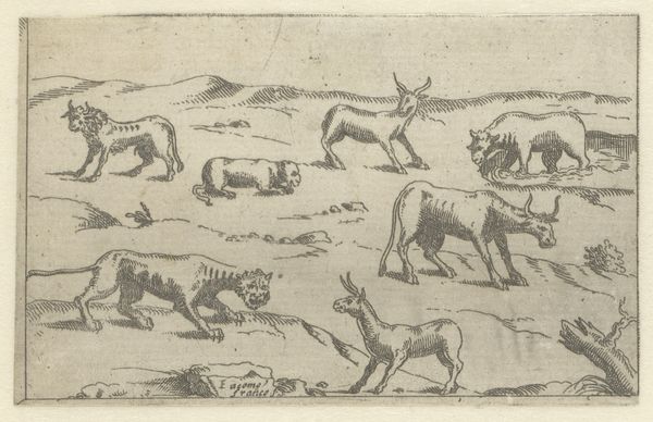 Editor: This is “Hier ziet men paarden in de weiden, / Met ossen, ieder onderscheiden [(...)]” from around 1806-1830, made by Johan Noman. It looks like a print – or maybe a drawing – with several panels showing different farm animals. I am immediately struck by the...I don't know, kind of charming, slightly naive feel? It seems to exist somewhere between detailed observation and cartoon. What do you make of it? Curator: Naive charm, yes, absolutely! And it reminds me that simplicity can hold so much. This piece, with its combination of engraving and pen work, transports me to a time when the rural landscape held a very different kind of cultural significance. What do you see in the depiction of the animals themselves? Editor: Well, they all seem very calm, posed almost. They're not interacting much, just kind of existing within their little frame. There's a remoteness, a separation from the viewer maybe? Curator: Precisely! And consider the time – early 19th century. Neoclassicism was in full swing, often drawing inspiration from idealized, agrarian visions of life. These animals, posed and somewhat detached as you say, could represent a longing for a simpler time, maybe an idealized vision of rural life... Did the artist succeed, do you think, or does the lack of 'action' let the whole thing down? Editor: I can see that! The sort of static, very neat quality perhaps speaks to that desire for order, or maybe an ordered vision of reality... and I also now read their placidity differently... like they exist as 'specimens', categorised... maybe even as "this is Holland" in a way... Curator: A Dutch brand, almost! Interesting... It reminds me that every artist makes choices... The key, as viewers, is that we allow art to trigger a fresh conversation each time... that is success, if you ask me! Editor: I completely agree. Thanks, I think I see more deeply into the work now, and understand some of its underlying social meanings.