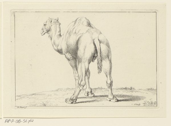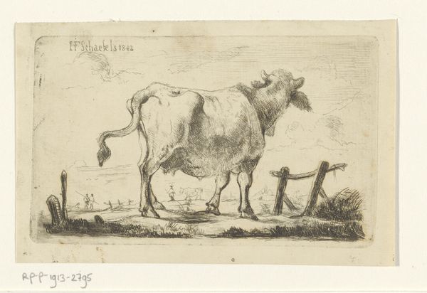 Curator: "Stier die zich krabt aan een boomstam," or "Bull Scratching Against a Tree Trunk," created around 1810 by Wouter Johannes van Troostwijk, is a striking etching in the collection of the Rijksmuseum. The stark realism captures a seemingly mundane scene of bovine life. What is your initial reaction? Editor: There is a subdued tension; a lonely stillness. Despite the bucolic scene, a hint of anxiety rests in the scratching bull, which gives way to a landscape almost too stark to offer respite. It makes me wonder about the broader themes of labor and the exploitation of nature inherent to agrarian life. Curator: A fascinating reading, tinged by a decidedly contemporary lens. The beauty of the etching lies, for me, in its exquisite attention to line and form. The cross-hatching technique is employed masterfully to build up tonal values, defining the muscularity of the standing bull and contrasting its texture with the smoother skin of the one reclining. Consider, also, how the lone tree becomes a stark vertical element in a relatively flat plane. Editor: But even that "masterful" use of cross-hatching and those stark planes you point to, don't they speak to a certain artifice? Van Troostwijk is not simply representing a scene, he's composing a narrative—and it’s worth asking who gets to write that narrative, isn't it? Land and livestock were, after all, profoundly contentious markers of privilege during the 19th century. Curator: Certainly. But observe how light and shadow play across the animals' forms, almost as if the artist wanted to glorify these symbols of pastoral labor as worthy artistic subjects, lifting the ordinary to the realm of high art, using the tools of realism to give the everyday— Editor: I’d argue against separating aesthetics from politics here. What looks like a humble depiction to you might very well mask the harsh realities of that time period. Van Troostwijk likely had certain ideas about who these cows "belonged to", how that ownership was justified, and whether the agrarian world had value in and of itself. Curator: So the composition asks us not merely to witness, but also question and resist the assumptions coded into representations of animals and the pastoral? Editor: Precisely. By situating such art in a more radical view of agrarian economics, we uncover critical reflections regarding class, work and society at large. Curator: An excellent interpretation of a deceptively simple etching. I appreciate your insights—it provides the image a rich opportunity for new thought.