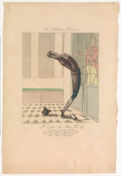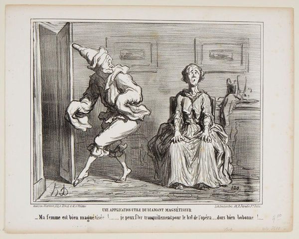 Editor: This is "Permissible Jokes: Horses" by Honoré Daumier. It’s a striking image. The way the horse dominates the doorway… it's almost dreamlike. What do you see in this piece? Curator: A horse entering a domestic space violates our sense of order. Daumier uses this jarring image to speak to a deeper anxiety. Consider the horse: a symbol of power, of aristocracy. Editor: So the horse represents the old guard invading the everyday lives of ordinary Parisians? Curator: Precisely. The cultural memory of the aristocracy still held sway, didn't it? And note the man’s reaction: fear, surprise. The horse becomes a symbol of the disruption of social norms. Editor: It's fascinating how a single image can hold so much cultural meaning. Curator: Indeed. Visual symbols are potent carriers of cultural memory.