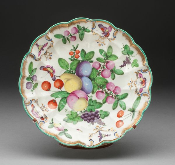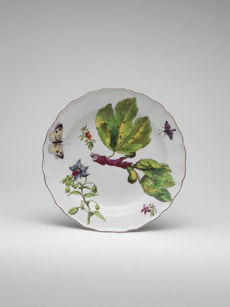 Editor: This delicate botanical plate, crafted by the Chelsea Porcelain Manufactory around 1750 to 1760, showcases a vibrant tropical specimen. It has a certain Rococo charm to it, almost playful. How do you see this piece within its historical context? Curator: This plate isn’t just a pretty object; it speaks volumes about 18th-century power structures and colonial desires. Think about who could afford such luxury porcelain and where these "exotic" botanical specimens came from. This wasn't simply about appreciating nature; it was about possessing and displaying the spoils of empire, a very gendered act I should add. Editor: That’s fascinating! I hadn’t considered the colonial aspect so directly. The flowers and insects almost seem like trophies now. Were there any specific artistic influences shaping this kind of decorative work? Curator: Absolutely. We must consider the Linnaean system of classification, a hierarchical framework that sought to organize the natural world. These botanical illustrations, while seemingly innocent, contributed to a scientific gaze that objectified and controlled nature, often for the benefit of European colonial powers. Moreover, who was given the power to depict these objects? And from what perspective? What knowledge may have been excluded? Editor: So it's less about simple beauty and more about asserting dominance through knowledge and ownership? It reframes my whole understanding of decorative art from this period. Curator: Precisely. This plate is a window into a world of unequal power dynamics. Examining art objects like this one compels us to rethink our own assumptions about beauty, nature, and the legacy of colonialism and reminds us of what those in power have the luxury to ignore. Editor: I see that now. Thanks to your insights, I’m realizing how much these seemingly simple objects are connected to much larger systems of power. Curator: And that's the ongoing conversation we need to be having.