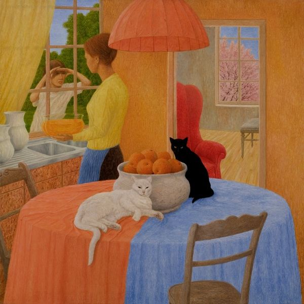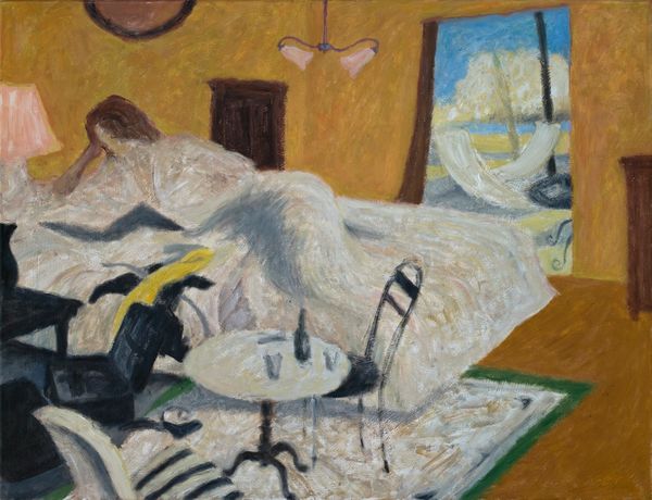 Editor: This is "Rainy Vacation," an oil painting by Iwo Zaniewski. It gives off this claustrophobic vibe, contrasting an idyllic beach scene with this almost garish interior space. What do you make of this contrast? Curator: You're spot-on about that contrast; it's precisely where the painting’s power lies. Imagine wanting so desperately to be *there* – at that beach, despite the gray sky – but being trapped *here*, in this strangely textured, somewhat oppressive room. Perhaps it’s about longing, about the gulf between our dreams and our reality. Or maybe it's simpler: a painter capturing a mood, a feeling. Editor: That feeling of longing… I see that. The colors inside are so… intense, almost artificial compared to the muted scene outside. Curator: Exactly! The clashing hues create a sort of internal disharmony. Do you see how the textures, particularly the brushstrokes in the room, feel almost agitated, while the ocean is relatively smooth and calm? It’s as though the turmoil is all internal. It makes me wonder what kind of 'vacation' the figure is truly on. Is it a vacation from themselves, from life, or from something else entirely? Editor: Hmm, that gives me a different perspective on why they might be facing *away* from the window. Maybe the inner world is just too much right now. Curator: Precisely! Art has a funny way of mirroring our own complexities back at us, doesn’t it? Perhaps we can relate in ways we don't always realize. Editor: That's so interesting to think about! Thanks; this was much more than I initially saw. Curator: My pleasure! Every painting is a little mystery box; sometimes, it just takes another pair of eyes to help pry it open.