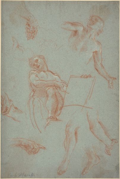 Curator: Oh, my goodness, the *atmosphere* of this piece just envelops you, doesn't it? Like a sigh escaping paper... Editor: You're responding, I imagine, to Hendrik Krock’s study of a draped female figure, rendered in pencil and pastel sometime between 1671 and 1738. It’s titled "Halvnøgen draperet kvinde, holdende en maske. 'Sandhedens afsløring'" or, in English, "Semi-nude draped woman holding a mask. 'Revelation of Truth'". It's held here at the SMK. Curator: "Revelation of Truth" you say? Intriguing. Though at first glance, the 'truth' seems a little veiled to me, if that's not too on the nose. The mask is held away, yes, but the shading seems to obscure as much as it reveals, no? Editor: Absolutely. That tension between unveiling and concealing is, I think, entirely the point. This was a period obsessed with allegory. Truth isn’t simply exposed, it's strategically revealed. The academy promoted history painting above other genres, and allegory often came with it, loaded with symbolism. So we have to ask, what truth is being alluded to here? And, for whom is this truth being revealed, exactly? Curator: You're thinking about power dynamics. Hmm, makes me think. Perhaps it's the artist revealing something about *himself* too, when choosing which aspects to highlight? And which to soften and blur...look at how lovingly he renders the texture of the fabric! You could almost feel the cool smoothness against your skin. But it makes you wonder about the model herself. Editor: Precisely. Who *was* she? Was she simply an anonymous body, or someone with agency, whose own perspective got elided through the symbolic and institutional imperatives placed upon the artwork? I see Krock's work as very much involved with ideas around spectacle and controlled public appearances. And these kind of sketches often worked as preliminary drawings. Curator: It is rather gorgeous, those preliminary sketches can catch the immediacy of the artistic process don’t you think. Such a gentle approach to quite thorny ideas too… So, perhaps what strikes you with social commentary, feels to me… somehow tender. But also leaves an echo lingering somewhere just beyond clear sight... Editor: An apt summary. Thanks to this interplay between openness and opaqueness, it still leaves a question mark lingering, I think, for us today.