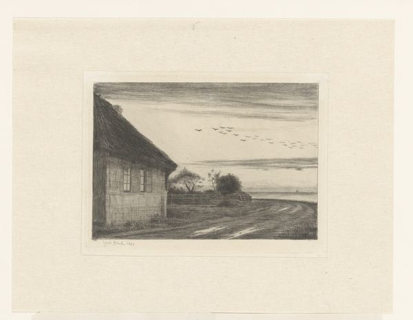 Curator: Here we have "Haystack by a Country Road," an etching and pencil drawing created in 1883 by Carl Bloch. What is your initial response to this delicate landscape? Editor: There's a quiet solemnity to it. The lone haystack under a ladder almost resembles a humble ziggurat, doesn't it? And the hazy atmosphere beyond contributes to a sense of understated grandeur. Curator: Precisely. Notice how the artist meticulously organizes the composition: The diagonal lines of the road and the haystack create a visual thrust, but it’s subtly balanced by the horizontal emphasis of the distant shoreline. Editor: The haystack, positioned so centrally, it feels like a direct echo of the agrarian ideal. Think about the cultural resonance of hay as a symbol: harvest, sustenance, the turning of the seasons and, ultimately, human labor intertwined with nature. Is Bloch engaging with broader Romantic notions here? Curator: I agree that Bloch invokes an elemental feeling through the scene; consider the textures that define form. The way he modulates pencil to capture light across the field against the coarser textures defining the haystack's body is truly stunning in how it maximizes dimensionality across a limited tonal register. Editor: Yes, but doesn't this scene feel weighted down by absence too? The ladder leans hopefully, but no figure is present, just a silent, rural monument. Are we meant to meditate on mortality, on the inevitable fading of natural forms back into the earth? The muted tonality would seem to underscore that melancholic reading. Curator: I appreciate that interpretation. Though I tend to interpret these visual choices less figuratively. Bloch is deeply attuned to the relationship between shadow and line—note how a slight shift in one radically reshapes our perception of form, transforming the mundane into something visually remarkable. Editor: A lovely observation. Seeing Bloch’s skill with depth has unlocked an entire appreciation for his vision, even when confronting melancholy and impermanence. Curator: And for me, it underscores how formalism invites viewers to contemplate line and structure and shape artistic experience, beyond our ordinary, personal contexts of viewing and meaning-making.