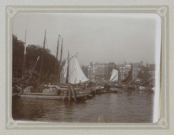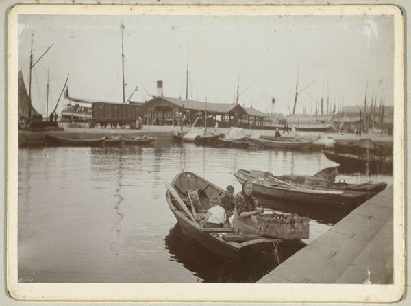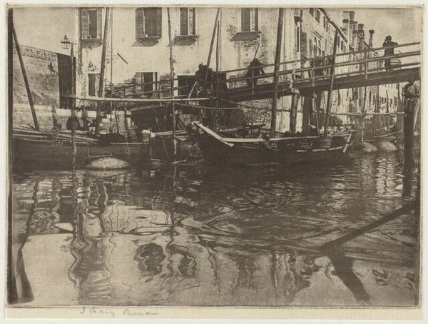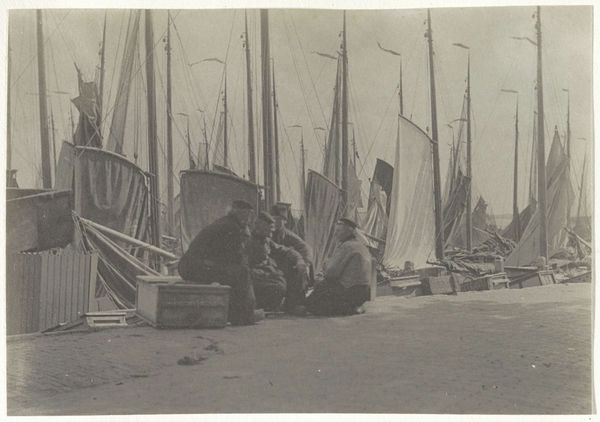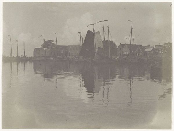 Curator: Peter Henry Emerson's "The Ferry," created in 1887, offers a compelling glimpse into late 19th-century England, presented as a beautiful photographic print. What’s your first reaction to it? Editor: Somber. It's almost entirely gray, with very few points of strong contrast. It’s as if the mist itself has been captured on the paper. Curator: That muted tonality is partly intentional. Emerson was a key figure in the Pictorialist movement. Pictorialism prized photography as fine art, prioritizing aesthetic effect over pure documentation. Emerson manipulated the print to soften the focus, obscuring sharp details to create that specific atmospheric effect. Editor: I see how the soft focus lends a sense of timelessness. But, in reality, maritime labor like ferrying goods and people was very demanding work at the time, deeply ingrained in class structure. The soft light romanticizes daily struggle. What can you tell me about the context of its production? Curator: Well, Emerson, who was trained as a surgeon, brought a scientific understanding of optics to photography, but he also saw it as a distinct art form. His approach was driven by careful use of the materials at hand, the lenses, the printing process, even the paper itself. He argued fiercely for photography's recognition alongside painting and sculpture. Editor: Yes, and in Pictorialism generally, this appeal to art status often served to distance the medium from its potential as a tool for social commentary, like what we see in the photojournalism that was emerging around the same time. The focus became about manipulating the materials to achieve the most aesthetic images, further alienating everyday labor. Curator: However, I’d add that the print does show an awareness of class difference. In many ways, it's a document of the labor required to keep commerce running smoothly at the time. It depicts workers involved with operating the infrastructure, no less relevant for having artistic ambitions. Editor: True, that ferryman, though small, is the center of the action, and the massive scale of the ships indicates global connections through trade, making us ask about the system sustaining the image itself. Overall, viewing the work through the lens of that socio-economic context illuminates its historical complexities. Curator: Seeing it from a vantage point that also emphasizes material process helps us value the artist’s skills to extract an atmosphere from something that could've just as easily felt cold or empty, which feels valuable when considered together.