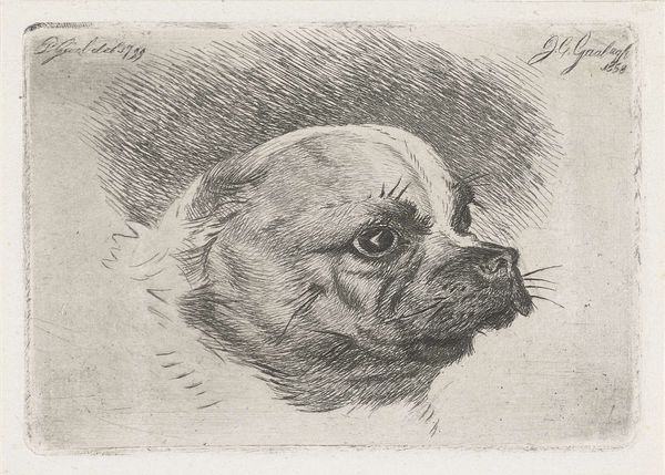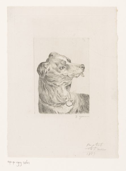 Otto Bache created this etching, "Et hundehoved," or "A Dog's Head," in 1901. The printmaking process of etching involves drawing an image into a prepared ground on a metal plate, and then using acid to bite away the exposed lines, allowing for printing. The linear quality of the etching technique lends itself well to capturing the texture of the dog's fur, as Bache has skillfully manipulated the density and direction of the etched lines to create a sense of volume and depth. The marks are a direct result of the artist's hand guiding the etching needle. The image appears soft, betraying the labor-intensive process of hand-drawing, biting, and printing. In this way, "Et hundehoved" elevates the tradition of fine art through skilled application and attention to craft, demonstrating that profound artistry can be found in the convergence of technique, material, and subject.