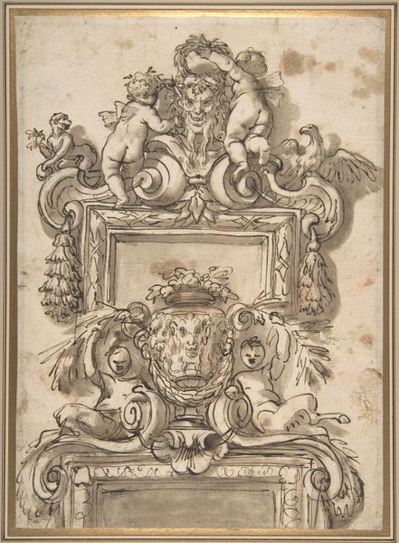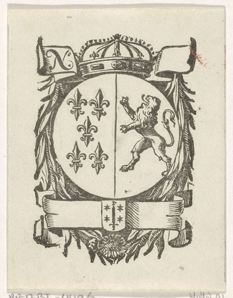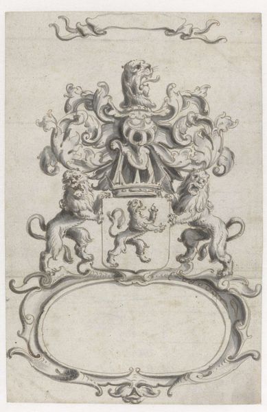 Pieter Jansz. created this crowned coat of arms with a climbing lion using pen in gray ink and watercolor on paper. The drawing’s modest size belies its function as a representation of power. The heraldic lion, meticulously rendered, embodies strength and authority. The choice of monochrome washes gives a sculptural quality to the design, as if it were a sketch for a silver or stone carving. Consider the labor involved in crafting such imagery in the 17th century. While not as intensive as weaving a tapestry or forging metalwork, the precise line work and shading demanded skill and patience. This would have been one step in a much larger process. The design, once approved, would likely be translated into other mediums - perhaps adorning a building, silverware, or a signet ring. Ultimately, this drawing reminds us that even seemingly simple images carry layers of meaning, reflecting the social structures and material practices of their time.