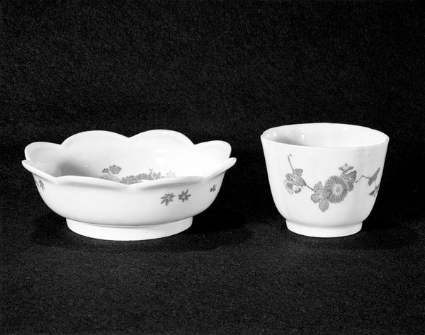 Editor: This is a porcelain bowl made sometime between 1735 and 1755 by the Meissen Manufactory. It's currently housed at the Metropolitan Museum of Art. What strikes me most is the delicate flower and those tiny insects, like someone captured a moment in a garden. What do you see in this piece, from your perspective? Curator: Ah, yes, the ephemeral beauty of a fleeting moment captured in porcelain. For me, it's the imperfection that speaks volumes. These aren't scientifically accurate renderings of flora and fauna. They're an artist's impression, filtered through the lens of imagination and perhaps a little humor. Do you notice how the insects seem almost comically oversized for the flowers? Editor: I hadn't really thought of them as humorous, more decorative, I guess. It is interesting that they aren’t perfect replicas, more like interpretations of nature. Curator: Exactly! This speaks to the period's fascination with the natural world, but also with adapting it to suit aesthetic tastes. These pieces weren't just functional; they were designed to delight, to spark conversation. It's like the artist is winking at us from across the centuries, sharing a private joke about the human tendency to embellish and idealize. It makes you wonder what kind of stories these bowls held, doesn’t it? Editor: It definitely makes me think differently about decorative art, seeing it as more than just pretty objects but as little windows into how people saw the world. I love that idea! Curator: Precisely! Art isn’t merely a static object, it's a vibrant portal of infinite dimensions. Each time we revisit a piece, our perceptions shift, we expand the portal, the past informs the future, and the creative adventure blossoms anew!