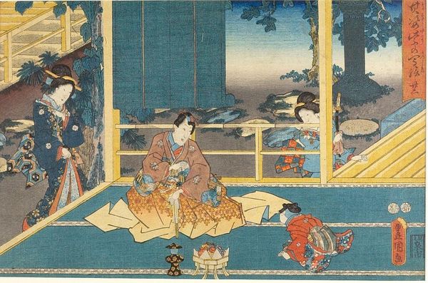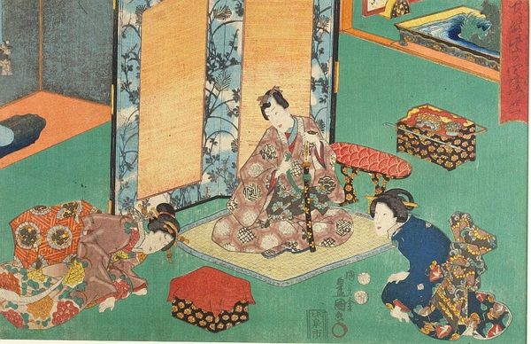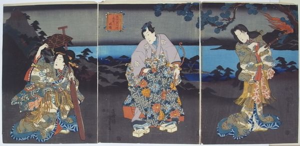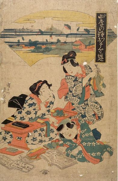 Curator: Utagawa Kunisada's "View of Ise Divers Processing Abalone" presents a vibrant scene. It really makes you wonder about the processes of abalone harvesting and preparation. Editor: There's a definite visual hierarchy at play. Note the contrast between the opulence of the kimono worn by the figure in the center panel and the relative bareness of the divers, suggesting differing social roles in the harvesting economy. Curator: Exactly! The print likely served not just as art, but as a kind of advertisement, almost like a visual document of the labor behind a sought-after food product. The materiality of the abalone and the diver's work are key to the image's meaning. Editor: The positioning and depiction of women is also interesting. You have the almost idealized divers by the seaside juxtaposed with the woman in elaborate garb with a fan. The print presents a controlled, constructed image of labor for public consumption. Curator: It really does highlight the intersection of labor and visual culture in 19th-century Japan. Editor: Absolutely, and considering the cultural and social forces that shaped its production and reception gives us much to consider.