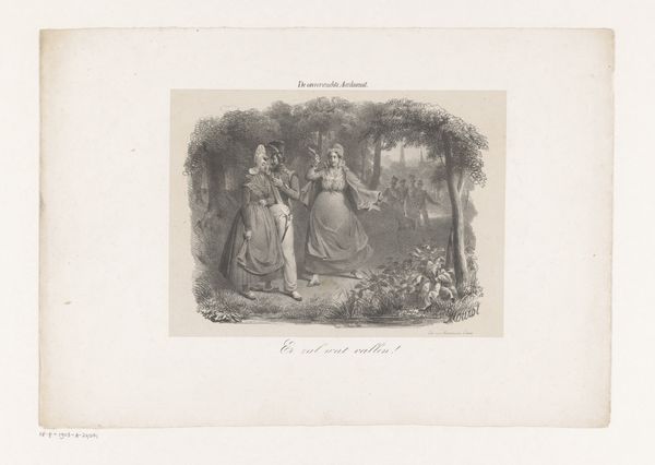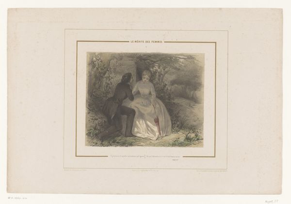 Jean-Pierre Moynet created this print, "Father, Mother, and Child in the Woods," in France in the mid-19th century using lithography and letterpress. The image presents an idealized vision of domesticity, a common theme in art during this era. It offers a window into the values and expectations placed upon women and families in 19th-century French society. The image creates meaning through the visual codes of gender roles and social class. The father, dressed in formal attire, stands slightly apart, holding a book, suggesting his role as the family's intellectual and provider. The mother is seated, cradling the child, embodying nurturing and care. This idyllic scene is set against the backdrop of a forest, a space often associated with nature and escape from the industrializing world. To fully understand this artwork, we must delve into the social and institutional histories of 19th-century France. Resources such as historical archives, literature, and social commentary from the period can shed light on the prevailing attitudes towards family, gender, and class. Art, like this print, serves as a lens through which we can examine and critique the social structures of its time.