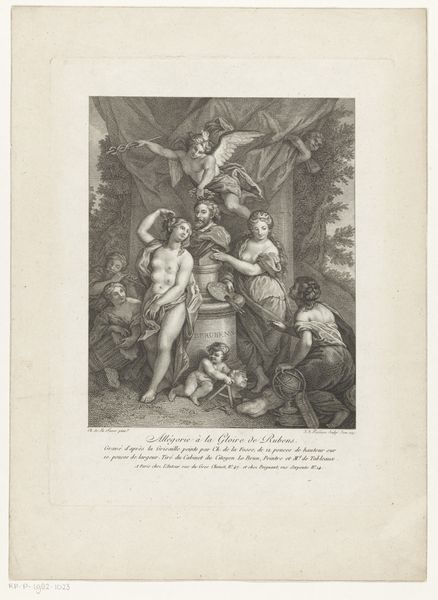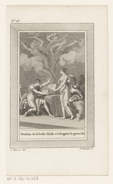 Editor: This engraving, "Stichting van Athene door Minerva en Neptunus" by Pierre Audouin, was made in 1801. It's incredibly detailed for such a small print. The contrast between light and shadow creates a really dynamic feel. What stands out to you the most about its composition? Curator: The most striking element, visually, is the division of space. Neptune, with his trident, occupies the left, commanding the aqueous domain, while Minerva, poised with the olive branch, presides over the right, symbolic of peace and prosperity. Consider the strategic use of line: Audouin employs precise, controlled lines to define form, creating a sense of classical order. Do you observe how the lines coalesce to define the musculature of Neptune and the drapery of Minerva? Editor: Yes, the lines are so sharp and clean! It's interesting how they almost seem to be competing, with Neptune's robust form and Minerva's more delicate stance. Is that tension intentional, do you think? Curator: Precisely! This tension is integral to understanding the formal argument. The opposition isn’t merely thematic; it’s fundamentally structural. The figures' contrapposto stances and the diagonal pull between them activate the surface. Notice how the framed composition creates an intentional space for a clear thematic goal and the olive branch punctuates the allegorical statement. Editor: So, the artist used these formal techniques to really highlight the contrast between power and peace? I never thought of prints being so… dynamic! Curator: Exactly! By carefully considering the interplay of line, form, and spatial arrangement, we gain a richer understanding of the artwork’s semiotic capabilities beyond the apparent mythology. Editor: That’s a completely new perspective for me. I appreciate the look into the framework.