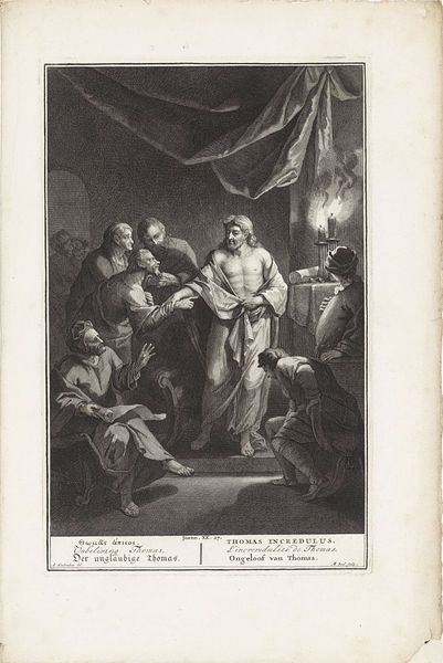 Editor: So, this is *Job op de mesthoop*, or Job on the Dunghill, an engraving, believed to be created sometime between 1704 and 1765 by Jan Lauwryn Krafft. It definitely evokes a feeling of suffering, but I’m curious about the woman pointing at him. What’s your interpretation of this work? Curator: Oh, Job! Krafft really captures the drama, doesn’t he? Notice how Job is the focal point but surrounded by these…accusatory figures. This isn't just about physical suffering. It's the theological debate playing out visually. Who do you think the artist wanted us to sympathise with? Editor: Probably Job? He looks pretty miserable sitting there. But that woman looks so angry. And what’s that flying devilish figure above? Curator: Exactly! She's usually identified as Job's wife, urging him to curse God. While his friends, clustered on the left, offer their dubious consolations. That hovering demon? Represents the source of Job's torment, unleashed with divine permission. The drama is heightened through that classical architectural backdrop, fragmented and crumbling just like Job's life, perhaps? Krafft seems to enjoy piling on the misery, no? Editor: I see what you mean. So, it's not *just* suffering, but questioning faith in the face of unbearable loss, too. It seems there's an entire philosophical discussion baked into the composition! Curator: Precisely. And look at how Krafft’s crosshatching creates a sense of grime and unease. Every line serves a purpose to depict moral, as well as physical, decay. Editor: This piece is a lot deeper than I first realized, seeing that everything, including his rendering technique, highlights the story being depicted! Thanks for making me see the image from another viewpoint.
