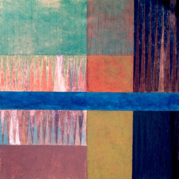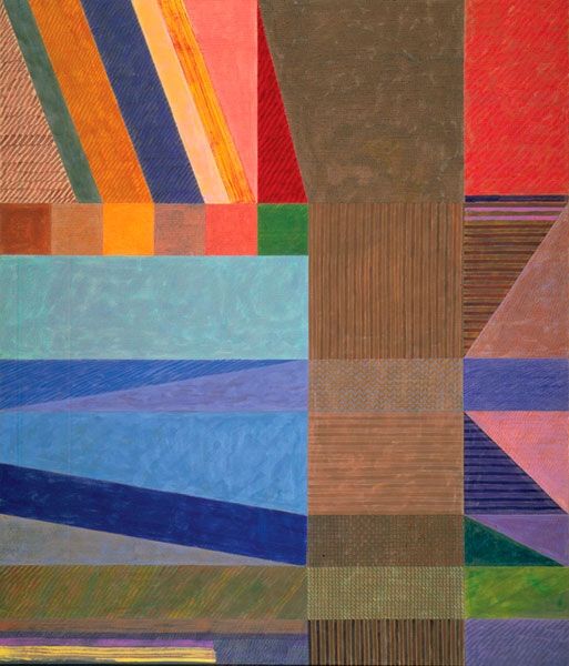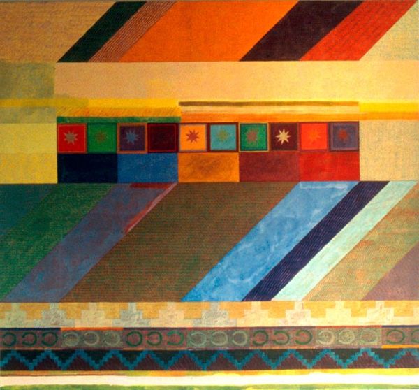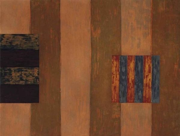 Joyce Kozloff made this painting, Agrigento, with some kind of paint, I think oil, and a lot of geometry. Look at how she's laid out the colours, muted and earthy but also a bit surprising. It's like she's mapping a place, but it’s also an abstract exploration. I’m really drawn to the surface. There are these vertical lines, like a rhythmic pulse, and they appear both planned and kind of organic. They make me think about how patterns emerge from chaos, how order and disorder dance together. See how the paint isn't too thick, but you can still feel the texture? It’s as if the painting is breathing. Think about Agnes Martin, but a little warmer, maybe? There’s something quietly powerful here, a sense of calm and meditation that invites you to get lost in the details. It’s not about one meaning; it’s about the experience.