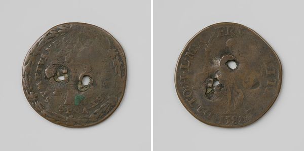Curator: Looking at this print now, a metal work dated from 1571 and held here at the Rijksmuseum, entitled “Filips II en Anna-Maria, koning en koningin van Spanje", I'm struck by its peculiar form. It’s not a traditional print, is it? It almost resembles a damaged coin. Editor: It does, and the damage is precisely what I find intriguing. Its fragmented nature speaks volumes, almost as if reflecting a fractured or incomplete historical narrative. A tangible relic imbued with potent political implications. Curator: Exactly! This print, this medallion if you will, circulated during a time of immense socio-political tension in the Netherlands under Spanish rule. It's crucial to examine the power dynamics it represents. Philip II and Anna Maria—their images reproduced and distributed, shaping public perception. It functioned as propaganda, embedding their power. Editor: And its materiality. That distressed metal finish gives it an archaeological quality. We need to consider how subsequent generations may have engaged with these damaged tokens, repurposing them perhaps, or viewing them with suspicion. Its existence prompts an essential examination of representation, circulation, and what endures from these complex narratives. Curator: I agree wholeheartedly. The damaged edges and the central square cut out... What narratives of resistance and revolution do you think are entangled within this symbolic destruction? This speaks to me of repressed narratives finally breaking to the surface. I imagine folks taking that symbolic value in hand during revolutionary movements. Editor: A powerful image to hold and, perhaps, a burden. Curator: Exactly! Thanks for bringing fresh eyes to it. Editor: My pleasure. It reminds us that our interpretation of art and history always contains a reflection of the present moment and contemporary concerns.