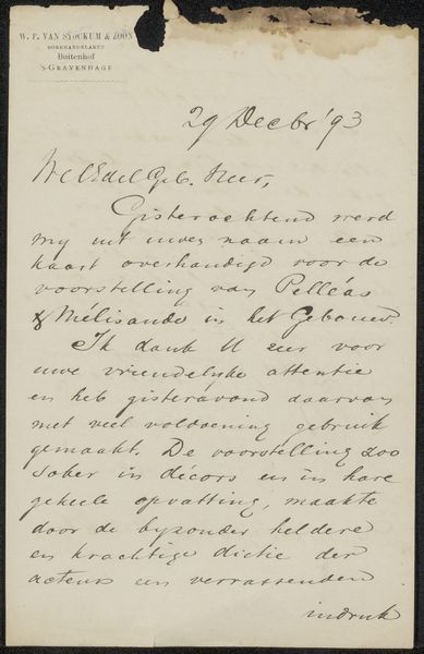 This handwritten letter to Philip Zilcken was written by C.M. Böhtlingk in December 1877 in Arnhem, Netherlands. It offers us an insight into the Dutch art world of the late 19th century and the social conditions that shaped artistic production at the time. The letter discusses financial matters related to a painting, revealing the economic realities artists faced. Böhtlingk mentions needing money for a "particular house or expo" and expresses concern about the painting aligning with Robber's work. This alludes to the competitive landscape of the art market and the pressure to conform to certain styles or trends. The institutional history of art exhibitions and galleries in the Netherlands likely played a significant role in shaping artists' strategies for success. As an art historian, I find this letter valuable as a primary source document. By examining such correspondence, along with exhibition catalogs, critical reviews, and biographical accounts, we can gain a deeper understanding of the social and economic forces that influenced the creation and reception of art in the Netherlands during this period.