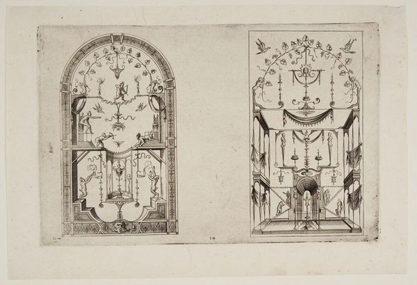 Editor: This is "Decoration XVI" by an anonymous artist. It's a print showing elaborate decorative schemes. I'm struck by the rigid symmetry. What can you tell me about its social context? Curator: Considering its symmetrical and ornamental elements, it likely reflects the influence of classical antiquity during a period of renewed interest in those styles. How do you think such imagery would have been received by the public then? Editor: Perhaps as aspirational, showing an ideal of beauty and order? Curator: Precisely. These prints often circulated as models, influencing architectural and decorative trends, thereby shaping the visual environment and conveying social values. Editor: So it's not just art for art's sake, but part of a broader cultural conversation? Curator: Exactly. The distribution and reception of these images played a role in shaping taste and cultural norms. Food for thought, isn't it?