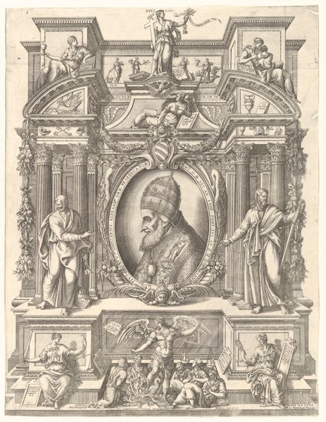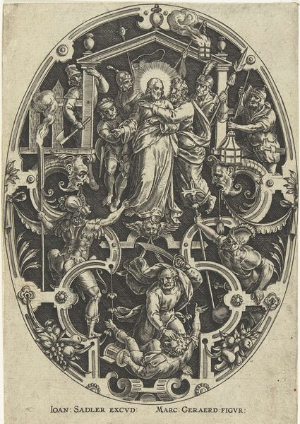 Curator: What strikes me immediately about this engraving, "Arrest of Christ, from Passion of Christ" dating roughly to the late 16th century, is how densely packed the imagery is within its oval frame. Jan Sadeler the Elder made it after a design by Marc Gerards. Editor: Absolutely! The scene is fraught with tension, a feeling emphasized by the intricate detail. Even though it’s a relatively small print, the swirling Baroque style conveys a profound sense of turmoil. Curator: The artist truly captures the historical drama of the subject. See how the central scene of Christ's arrest unfolds, flanked by those elaborate ornaments including religious and secular imagery, and scenes alluding to the past and future. Editor: And it’s vital to unpack the figures that enable this arrest, we must consider how the historical interpretations of these events have fostered a long legacy of anti-Semitism that remains harmful today. The cultural implications of portraying these power dynamics resonate profoundly through centuries of violence and bigotry. Curator: That’s a crucial point, reminding us of art's capacity both to reflect and perpetuate harmful narratives. Still, consider also how the iconographic motifs—the rooster, the helmeted figures, each animal— function within this symbolic composition. Editor: For me, understanding that these symbols function within a larger system of historical power is critical. Art isn't created in a vacuum. What choices has the artist made in this rendering, and whose gaze is prioritized? What historical realities does it encode or conveniently omit? Curator: That approach truly acknowledges the layers of meaning that an image such as this can convey across generations. Editor: Yes! Bringing together history and cultural narratives with the language of the artwork helps create a powerful story of faith and the social and cultural realities embedded in visual imagery.
