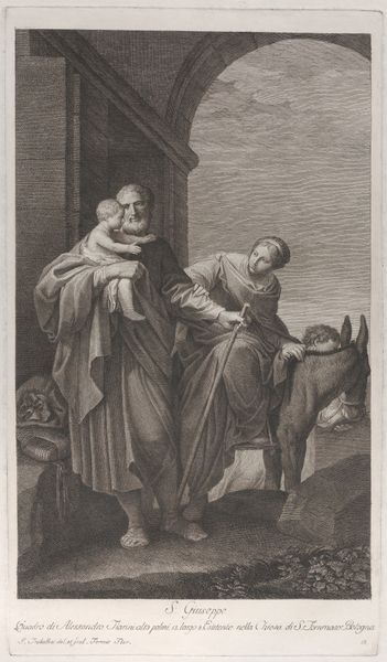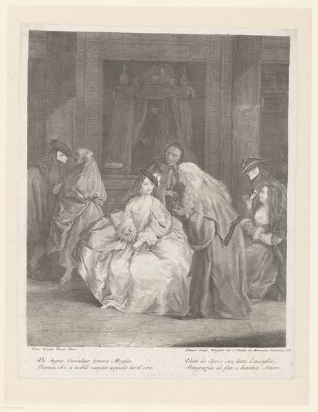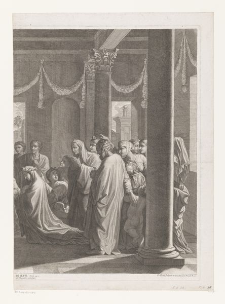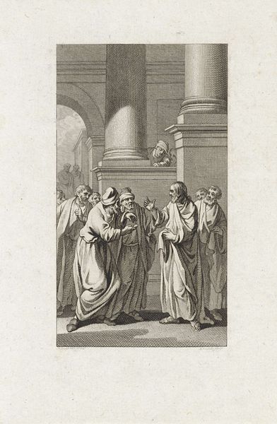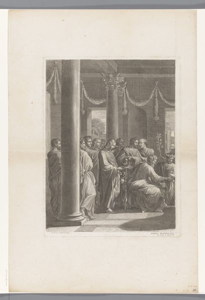 Curator: Here we have "Aankomst van de Heilige Bruno in Rome bij Urbanus II," or "The Arrival of Saint Bruno in Rome Before Urban II," crafted by François Chauveau between 1623 and 1676, housed here at the Rijksmuseum. A baroque print in the line technique. Editor: My initial impression is… weight. Despite being a line engraving, there's a monumental heaviness conveyed, especially in the drapery and the architectural elements. It feels somber, doesn’t it? Curator: Absolutely. The texture comes from the medium itself. Think of the laborious process: the artist carefully incising lines into a metal plate, controlling the pressure and angle to create varying depths. Editor: So the mood of the work—the solemnity you mentioned—is actually rooted in the making. Each line a conscious act of labor. Curator: Precisely. And the choice to depict this historical moment—Saint Bruno’s arrival, a gesture of reverence to Pope Urban II—it elevates the church and its figures through meticulous detail and skillful representation. This isn't just paper; it's a carefully produced, politically charged object. Editor: It’s fascinating how the economic realities—the labor of the engraver, the market for these prints, even the cost of paper and ink—underpin such an idealized image of spiritual devotion. Curator: You make a great point. This print underscores how faith, power, and materials are intertwined. It's less about spontaneous inspiration and more about carefully planned production. Editor: Well, now when I look at this engraving, I appreciate how its creation mirrors, in a way, the kind of reverence it shows in the scene depicted. A quiet, careful act of devotion in its own right, rendered materially. Curator: That’s lovely way to put it, understanding a moment in history shaped by tools and deliberate production!
