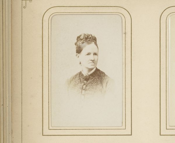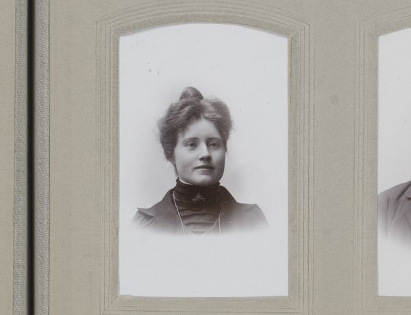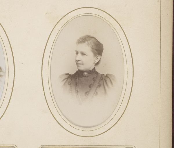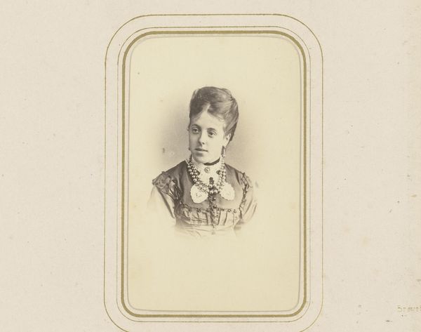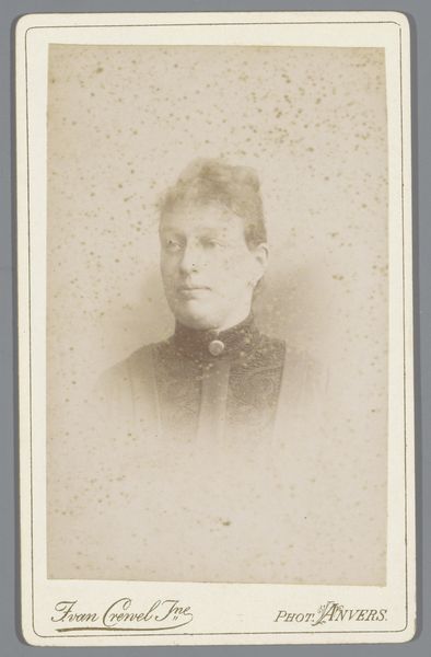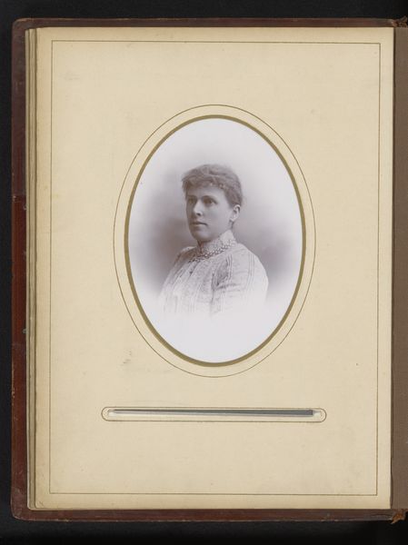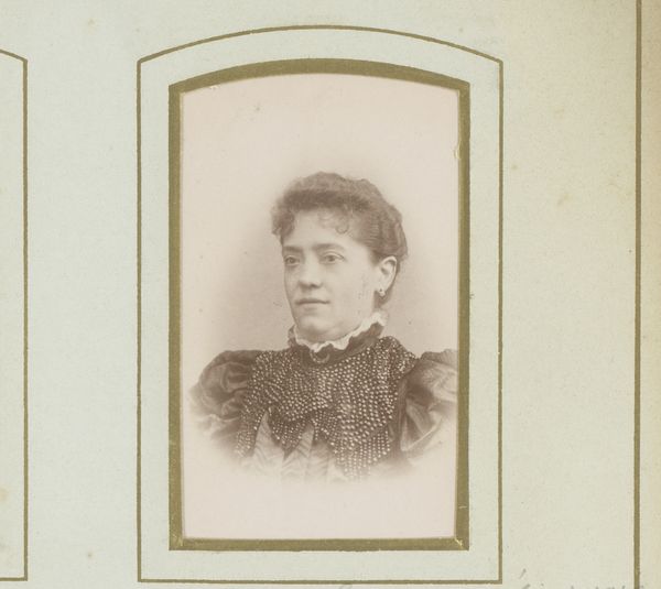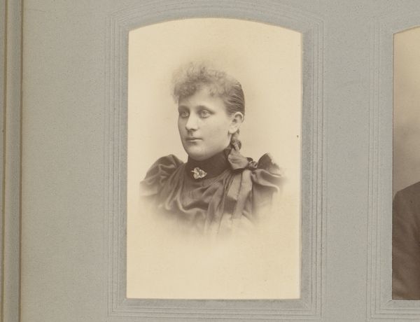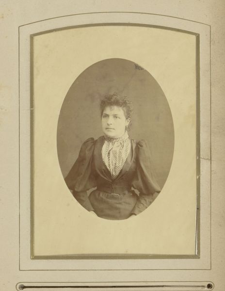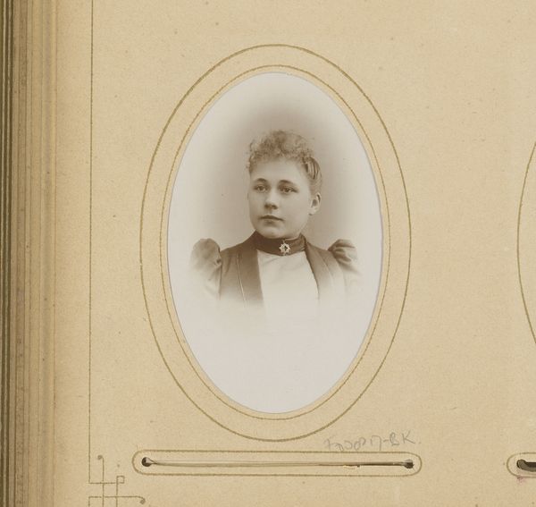 Editor: Here we have “Portret van miss Garrity,” a photograph from between 1880 and 1910. The sepia tone and soft focus give it such a dreamy, almost ethereal quality. It feels very intentional. What do you see in this piece from a formalist perspective? Curator: From a formalist reading, the appeal resides less in its representational content than in its visual structure. The composition itself creates that "dreamy" quality. Notice the delicate interplay between light and shadow across her face. The photographer’s manipulation of tonal range invites a deeper look into the texture and depth created within a monochrome palette. Editor: The light is interesting, especially on her face and how it almost diffuses the background. How does the choice of sepia tones affect your interpretation? Curator: The sepia tone here isn’t merely aesthetic; it fundamentally impacts the photographic texture. It reduces contrast, fostering subtle gradients that lend a sense of softness. Do you see how the careful graduation of tones, more than a sharp focus, defines the form? Editor: Yes, it softens the edges. Are you suggesting that this is more than just a record of her appearance? Curator: Precisely! Through specific choices in lighting, focus, and tone, the photographer invites the viewer to analyze the constructed reality presented. The photographer is using the medium as an artistic language. Editor: This really highlights how even a portrait is a constructed image, and understanding the visual language informs that reading. Curator: Exactly. It challenges the conventional perception of photography as purely mimetic, guiding us to appreciate the artistry inherent in its construction. Editor: Thank you! It’s great to consider photography as a medium beyond simply recording.