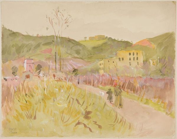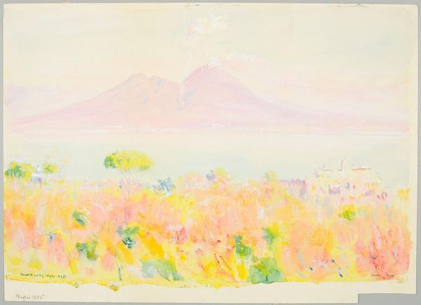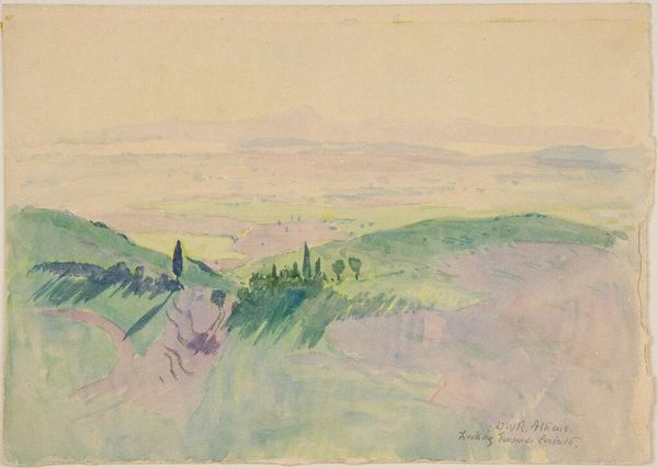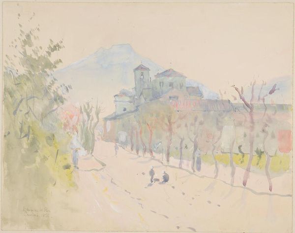 Curator: Robert David Gauley's watercolor, "Monte Cassino," presents us with a landscape viewed through a veil of pale color. The Harvard Art Museums hold this delicate work. What are your first impressions? Editor: It feels like a dreamscape, almost ethereal. The soft washes of color give it a sense of distance, both physical and perhaps temporal, like a memory fading. Curator: Monte Cassino, of course, holds powerful symbolic weight, particularly given its role in the Second World War. The abbey has been a site of spiritual significance for centuries. Editor: Yes, and the abbey's repeated destruction and reconstruction speak to resilience, but also the cyclical nature of conflict. Does Gauley's soft rendering somehow sanitize that history? Curator: Perhaps. Or it emphasizes the enduring spiritual essence, the idea of transcendence even amidst destruction. The lightness of the medium lends itself to that reading. Editor: I find myself wondering about the politics of representing such a charged site with such gentleness. Is it reverence, or avoidance? Curator: It leaves us to consider the visual language we use to depict places of both immense beauty and historical trauma. Editor: Indeed. It reminds us how complex the relationship between art, memory, and power truly is.
