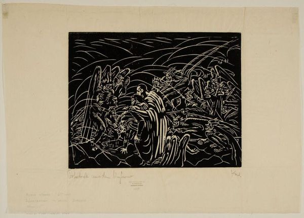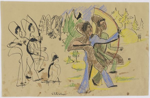 Curator: Ernst Ludwig Kirchner's woodcut, "Haymakers," now at the Harvard Art Museums, immediately strikes me with its high contrast and dynamic composition. Editor: The frenetic energy is palpable, yet it also suggests a commentary on labor and the human cost of production. The figures seem almost dehumanized by the harsh, angular lines. Curator: Indeed. The stark juxtaposition of green and yellow creates a visual tension that mirrors the strenuous nature of their work. Note how the artist employs a limited palette to maximize the expressive potential of form. Editor: I'm also interested in the way Kirchner situates these rural workers within a broader socio-economic framework, suggesting a critique of industrialization's impact on traditional ways of life. The print highlights issues of class and the exploitation of labor. Curator: I agree. The composition is intentionally jarring, pushing beyond mere representation toward a more psychologically charged depiction of rural life. Editor: A powerful statement about the human condition.