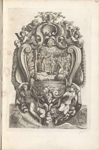This is Franz Ertinger's "Holy Water Font with Angel," an etching. While the exact date of its creation is unknown, Ertinger was active in the latter half of the 17th century. The print offers a glimpse into the intersection of religious devotion and the dominant social structures of the time. The cherubic figures adorning the holy water font aren't just innocent decorations; they symbolize purity and divine favor, concepts deeply entwined with power dynamics. Positioned at the top and bottom of the scene, they serve as gatekeepers to a spiritual experience mediated through prescribed religious rituals. In the middle ground, a winged figure extracts water from stone. Consider the function of holy water itself – it's meant for purification, a symbolic cleansing of sins, and a reaffirmation of faith within a hierarchical religious framework. Ertinger's work reflects the period's emphasis on religious observance as a means of social control, but also alludes to how the aesthetic and the spiritual life are intertwined.