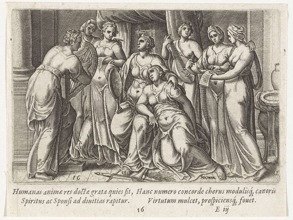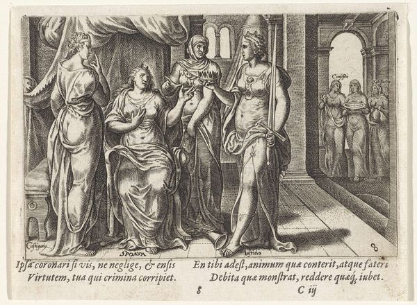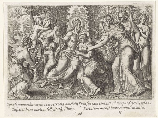 This print by Wierix, made around the late 16th century, depicts a bride being crowned, surrounded by allegorical figures. The act of crowning, a symbol of authority and divine approval, carries echoes from ancient coronation rituals. Here, the crown is not just a symbol of earthly power, but also a connection to celestial virtues. We see figures that seem to represent virtues, attendants to the bride, offering her guidance. The gesture of placing the crown resonates with similar motifs found in religious iconography, such as the crowning of the Virgin Mary. This act symbolizes the acceptance and approval of the bride into a new state of being. Consider how these symbols are passed down, changing slightly, yet retaining a core emotional power. Even today, the ritual of crowning evokes a deeply ingrained sense of respect, authority, and a touch of the sacred. It speaks to the subconscious desire for order and validation, themes deeply embedded in our cultural memory.