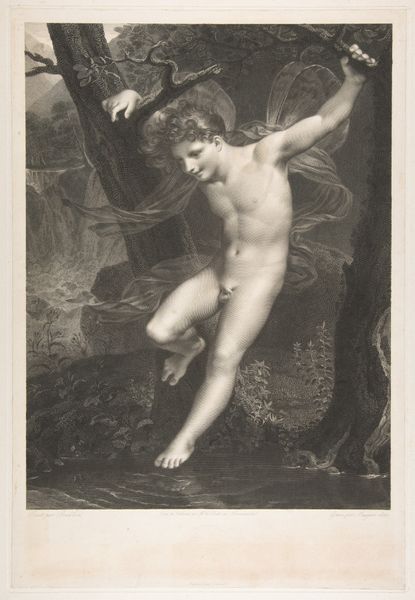 Editor: So, this painting is "Young Zephyr Balancing Above Water," by Pierre-Paul Prud'hon, done in oil paint. I don’t see a date. There's a definite softness to it, almost like a dream. The figure, this youth, looks suspended between light and shadow. What stands out to you when you look at it? Curator: The romantic idealization is evident, and it's crucial to acknowledge the historical context that birthed it. It's a neoclassical ode to the male form and a visualization of idealized beauty and boyhood, but also an act of positioning that image within specific power structures. What does Zephyr represent here? Editor: He's a mythological figure, the god of the west wind… so, something about gentle breezes and spring? But the painting doesn't feel that breezy, does it? Curator: Exactly. Is it celebrating freedom and nature, or subtly reinforcing a particular understanding of youthful masculinity and its relationship to dominance? Prud'hon presents this body, knowing exactly how and for whom this figure is created and placed within art history. Consider the historical fascination with Classical mythology, which was often deployed to legitimize contemporary political and social hierarchies. Editor: So you're saying that even an image that seems innocent, of a beautiful youth, is doing political work? Curator: Precisely. And note how this “balance” is presented, literally and figuratively, on the precarious balance between a young person on the cusp of becoming and what their possibilities will look like at that intersection of beauty and mythology. How might Prud'hon subtly be implying these power dynamics? Editor: I hadn't thought about it like that. It's almost unsettling now, knowing that there's a deeper layer. Curator: It's about critically engaging with the past, acknowledging its complexities, and being aware of the power dynamics embedded within these images. It changes our experience of this historical narrative to something more alive and relevant, right?