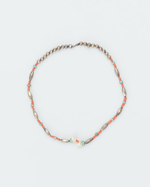 Curator: Looking at this piece, I’m struck by its quiet simplicity. It's a textile work titled "Necklace," dating from around 1960. It’s part of the decorative art collection here at the Minneapolis Institute of Art. What are your first thoughts? Editor: It's intriguing, almost ethereal. The pale colour palette and the delicate threads evoke a sense of fragility. But there’s also something repetitive and rhythmic in the geometry that suggests a strength in unity. Curator: Indeed. It sits within a lineage of fiber art that increasingly sought recognition as "high art" during the mid-20th century. How do you think its function as adornment intersects with artistic intention? Editor: Well, historically, jewellery is loaded with socio-economic and political symbolism – declarations of wealth, markers of status. A piece like this, created during the cultural shifts of the 1960s, might suggest a move toward something more minimalist, even democratic. Is it a rejection of more ostentatious displays? Curator: It certainly moves away from overt displays of luxury, which speaks to a wider move by artists and makers towards accessible artforms. The materials, being largely fiber, suggest a connection to the handmade, and possibly a subtle nod to crafts historically gendered as feminine. The light, beaded part seems to call out from an ocean vibe. Editor: Precisely. We also see this around this period within the decorative-arts movement – and wider societal anxieties around consumerism. The simplicity then, might not just be aesthetic, but a statement about sustainable practices and values. The materials possess certain truth and transparency. Curator: Do you believe this reflects a broader understanding of how art reflects identity? How one chooses to represent themselves in the world as an act of self-determination and, potentially, resistance? Editor: Absolutely. Adornment is inherently performative, and in a period defined by rapid change and growing awareness of diverse identities, the deliberate choice of such a piece would have undoubtedly signaled something intentional. The choice of art like this has many different layers and interpretations for the viewer and the wearer, past and present. Curator: It seems as if we have two layers exposed through its historical significance and its role in shifting narratives. The beauty that resides beneath that we should take a closer look. Editor: Well said. And perhaps it's in the dialogue between history, the wearer and theory that the piece ultimately comes alive.