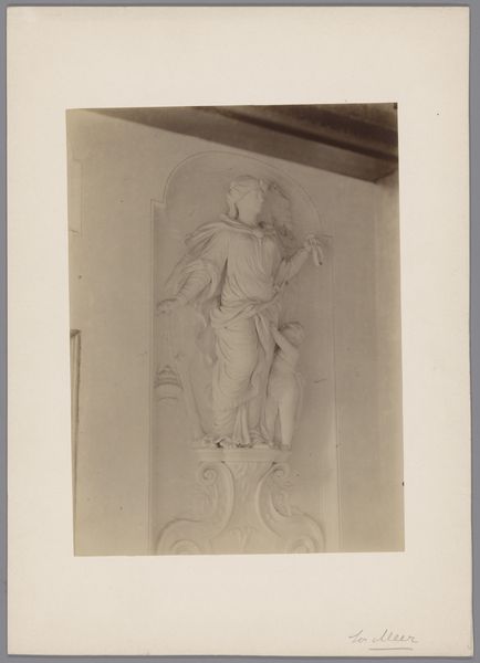 Editor: This photograph, taken around 1903, captures "Beeld van een vrouw met een spiegel in het Huis ter Meer te Maarssen," depicting a statue of a woman with a mirror. I find the photograph's subdued tones quite striking. What’s your perspective on it? Curator: Well, placing this photograph within the context of monument conservation reveals layers of historical meaning. Photographs like this from the early 20th century played a critical role. These were tools used in preserving architectural heritage and disseminating ideas about national identity. Editor: So it's less about art and more about… documentation? Curator: Exactly! The image serves a very practical, political purpose. It asks us to consider which objects and sites society deems valuable enough to preserve and promote. Note how the setting, Huis ter Meer, contributes to the national narrative. Now, does the composition influence its reception and role? Editor: The soft focus and almost romantic light sort of elevate it beyond simple documentation, making the statue look almost ethereal, reinforcing the perceived importance. But this focus shifts once you understand how instrumental the image could be. Curator: Precisely. It’s a negotiation between objectivity and deliberate framing – pun intended! We see this romantic presentation, but it's there for a particular function: to reinforce an image of a national artistic identity in that period. It forces us to reflect on how institutional structures impact how an artwork is presented and what purposes it ends up serving in broader societal schemes. Editor: So, it's not just an image, but also a powerful political act. I now understand the complexity behind seeming simple visual artifacts, thanks. Curator: Glad to have shed some light on the fascinating social function of visual pieces like this photograph!