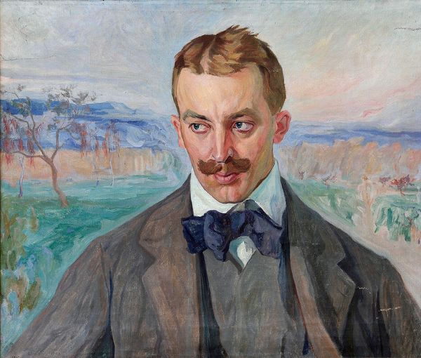 Curator: John Quinton Pringle's "Portrait of the Artist’s Elder Brother - Christopher Nisbet Pringle" offers a glimpse into the artist's personal life. I find it quite striking. Editor: Immediately, I'm drawn to the portrait's almost unsettling intimacy. The elder brother's gaze feels both direct and somehow detached, reflective of the complex socio-economic pressures of the time. Curator: Pringle, painting in the late 19th and early 20th centuries, often depicted working-class life in Glasgow. This portrait, though, feels different. It has an air of bourgeois respectability, a deliberate presentation. Editor: Absolutely. Look at the formal attire. The plaid vest, the dark jacket. This isn't just a depiction of familial affection, it's an assertion of social standing during a period of intense class stratification. How do we interpret that now? Curator: It's a reminder that even within families, social and economic considerations played a crucial role. Pringle's artistic journey itself was shaped by these forces, his struggle to gain recognition in a hierarchical art world. Editor: The work speaks to the intertwined nature of identity, class, and artistic representation. It challenges us to consider how these portraits reinforce or disrupt social norms. Curator: Indeed, considering the complexities of representation, I'm now wondering about the dynamic between the two brothers themselves. Editor: Yes, and how that dynamic is framed and presented for public consumption. Always more to consider.