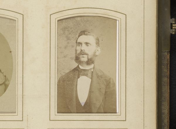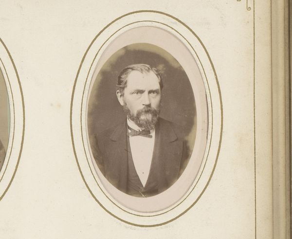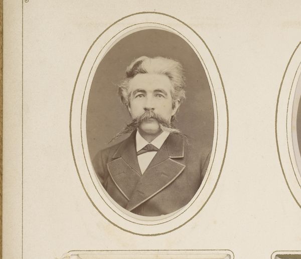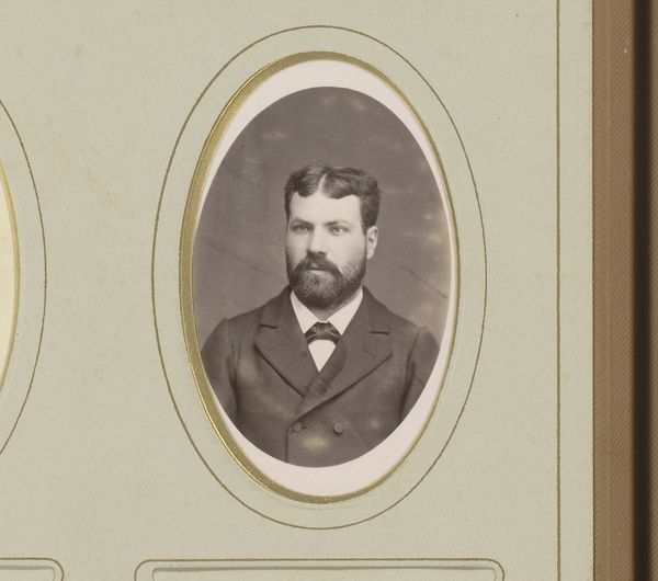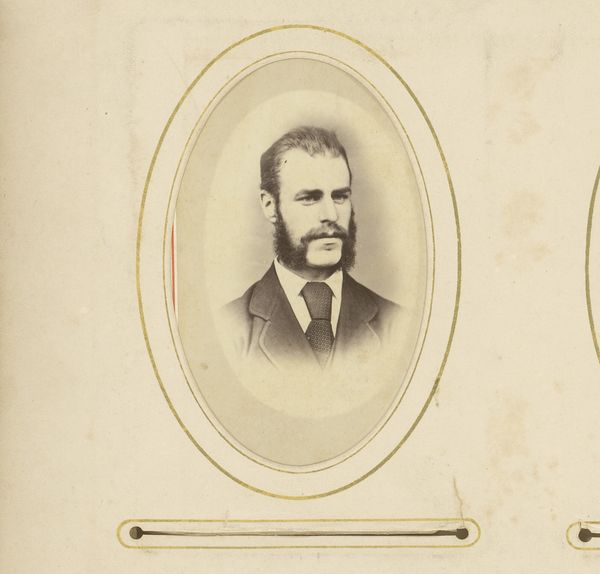 Curator: Here in front of us is "Portret van een man met snor en bakkebaarden" a photograph whose title translates to "Portrait of a man with moustache and sideburns". The portrait is a gelatin-silver print made sometime between 1873 and 1891 and resides here at the Rijksmuseum. Editor: My initial impression? Reserved, dignified...slightly melancholic, perhaps. The oval framing softens the subject somewhat, though the strong mustache definitely draws the eye. Curator: These portraits were a common element of social life at the time. Photography studios offered standardized poses and props, so these types of images reflect bourgeois aspirations, even as the sitters attempt individual expressions. Editor: Absolutely, but even within that framework of expectation, those choices convey meaning. That moustache, those bushy sideburns – they represent the Victorian obsession with masculinity and self-presentation. It’s such a powerful symbol of the era, isnt it? A display of virility almost. Curator: I agree, though perhaps the deliberate adoption of this masculine image reveals the pressure on men in that era to conform to a societal role. Note also how his direct gaze seems meant to convey respectability within this social frame. Editor: But does it succeed? I almost sense some fragility behind that firm gaze and facial hair. He isn't smiling; instead, a weight seems to settle on the figure which could communicate the struggles present at that time. Perhaps a fear to conform. It evokes a complexity. Curator: Interesting take. He represents, to me, the burgeoning middle class trying to solidify its place in society. Editor: To me, he mirrors all people who have ever attempted to hide. How intriguing that these static portraits still whisper stories. Curator: Indeed, that sliver of humanity in the historical context connects this portrait beyond its time.