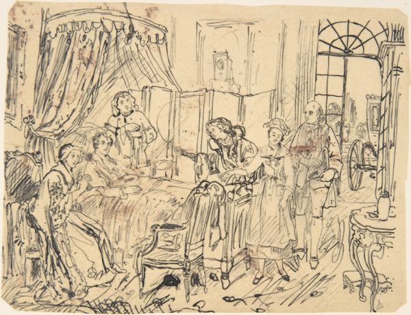 Editor: So, this is "Boereninterieur met vier mensen etend rond een tafel," or "Farmer's Interior with Four People Eating Around a Table," by Henri Wouters, dated between 1876 and 1932. It's a graphite drawing on paper. There's something very stark and intimate about it at the same time. What strikes you when you look at this piece? Curator: What stands out for me is how Wouters depicts everyday life with such raw honesty. Considering the period, the late 19th to early 20th century, this interior scene speaks volumes about class and labor. Do you notice the austerity of the setting? It hints at the socio-economic conditions of the working class. Editor: I do see that now that you point it out. The sketchiness almost emphasizes a lack of refinement. Is it a critique? Curator: Possibly, or perhaps a raw representation devoid of romanticism. Think about realism as a movement and its intersection with early socialist thought. How does this contrast with the glorified depictions of rural life that were common at the time? The lack of idealization prompts us to think about the labor and hardship inherent in the lives of these farmers. Also, what can we infer from the seating arrangement around the table? Editor: I suppose it shows equality, that everyone gets a seat at the table despite gender or age differences. Curator: Precisely! Or perhaps it just a fact of peasant life. But consider how it promotes a kind of social awareness, presenting the figures without artificial enhancements or glorification. It serves as a document of their time. The setting is humble but equal, offering insights into the values and conditions of this group. Editor: It's incredible how much is communicated through such a simple sketch. I am starting to think that maybe all art has some type of underlying activism and social narrative if we really delve into the context surrounding it. Curator: Indeed. Looking closely can teach us so much about the communities surrounding the artist.