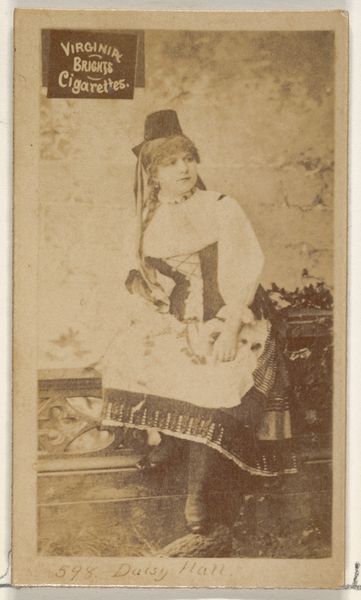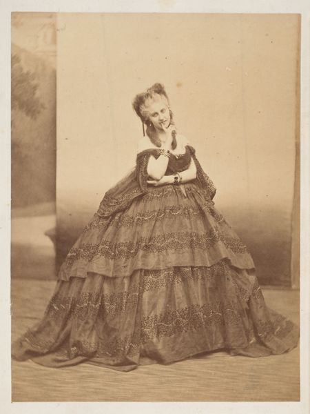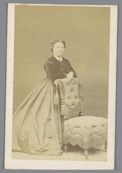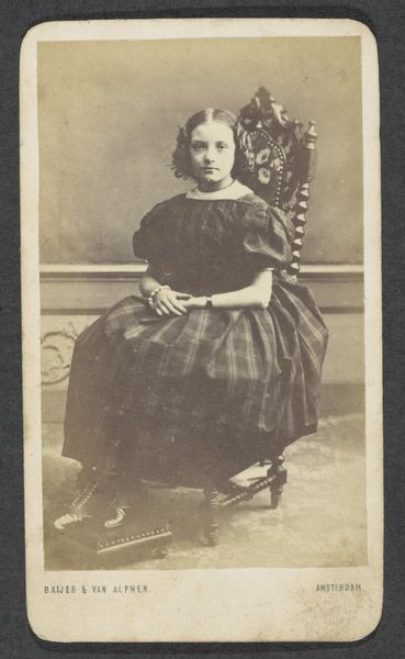 Curator: Looking at this “Portret van een onbekend meisje”, dating from 1855 to 1885 and attributed to C.W. Vink, one is struck by the formality and the techniques deployed in this gelatin-silver print, don't you agree? Editor: I am! My immediate impression is one of quiet introspection. The girl's gaze, though direct, feels withdrawn. She’s enclosed, both physically by that enormous checkered dress and perhaps psychologically. The colours, muted with age, reinforce that subdued feel. Curator: Yes, the muted tones create an antique charm. What I find compelling is the staged nature of it all—the backdrop, clearly a painted scene, contrasts with the relatively natural pose of the girl. It reveals much about the public role of imagery and the societal norms dictating portraiture during that era. Editor: Indeed. Backdrops like that transport me. We tend to perceive the Victorians through such severe lenses, yet these artificial backgrounds provide a window into their imaginations, hinting at dreams and fantasies that contrasted with the stricter societal expectations. What about the chequered pattern of her dress? It almost feels too prominent. Curator: A very relevant point! The pattern likely served as a signifier, possibly alluding to the family’s economic status or affiliation with a particular movement, it demands to be understood. Such images played crucial roles in establishing and broadcasting identity. Photography like this became part of building a social history of the bourgeoisie. Editor: And think about the young girl: how much power she actually held in this performative act. The pressure to embody the values, the constraints put upon young woman during the time... Her seemingly direct gaze turns almost confrontational viewed from this perspective, like she is questioning it all. Curator: I concur; in the late 19th Century, photographic portraits became powerful tools in controlling narratives and cementing societal power structures. Looking closer at the background we may even speculate how accurate it presents social realities, creating new layers in her “real life”, a tension only photograph offers. Editor: Absolutely. Looking at this portrait from a contemporary viewpoint it almost appears absurd in some parts. It helps to contemplate the cultural codes underpinning this photographic genre, revealing more of the time than perhaps even the artist fully appreciated. Curator: It’s true—a reminder of how art continues to generate discussion long after its creation and how even through seemingly static images like this we understand cultural evolution in a very different ways than when it was shot. Editor: Agreed. In fact, revisiting photographs of this kind underscores how vital art history and understanding symbolism is. Thank you!