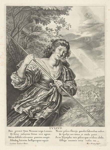 This print, Juli: een oogstende vrouw, was made by an anonymous artist and printed by G. Valk. It's made from the straightforward materials of ink on paper, but through the skilled technique of etching, a complex image emerges. The etching process allows for fine lines and tonal variations, which we can see in the rendering of the woman’s drapery and the landscape. This method requires a trained hand, working carefully to create a design that captures the essence of labor. The print shows the seasonal toil of reaping what you sow. But consider the labor of the printmaker too, and its relationship to the image it bears. Etchings like this one were commercial products. They speak to the social context of the time, where agriculture was a dominant force. "Juli" invites us to consider the labor represented and the labor required to make it.