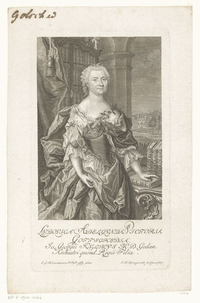 This is Johann Martin Bernigeroth’s portrait of Johanna Mariana Weinmann, created using etching techniques. The composition immediately draws our eye to the subject, who is centrally positioned and illuminated against a softly rendered landscape backdrop. Bernigeroth employs a delicate network of lines to define form, create tonal variation and textural contrast. Notice the intricate detailing of her dress: the billowing folds, the sheen of the fabric, and the delicate lace trim. It suggests a semiotic system of wealth, status and femininity. The landscape, on the other hand, is sketched with a lighter touch, its purpose to frame rather than compete. This contrast plays with ideas of foreground and background, artifice and nature. Johanna’s slightly averted gaze and the gesture of her hand add to the sense of psychological depth, destabilizing any fixed meaning we might impose on her identity. The artist leaves room for interpretation, a space where we, as viewers, can engage in a dialogue with the artwork.
