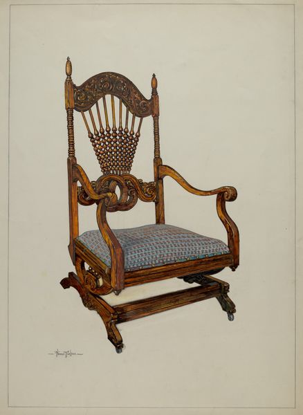 Natalie Simon created this rendering of a bed using watercolor and graphite, at an unknown date. Simon was born in an era marked by distinct gender roles and expectations. Consider the bed, often associated with the domestic sphere and traditionally linked to women's roles as homemakers. This piece invites a reflection on women's confinement to private spaces, as well as the societal norms that dictated their identities and limited their opportunities. This image prompts us to think about the history of domestic labor and gendered expectations, while acknowledging the bed as a site of rest, intimacy, and personal reflection. The choice to represent it highlights its cultural and symbolic significance. The artwork develops alternative narratives by representing the domestic sphere as a symbol of both comfort and confinement, reflecting the complex realities of women's lives during that era. Simon's artistic interpretation of "Bed" encourages us to question and challenge conventional representations of women and domesticity.