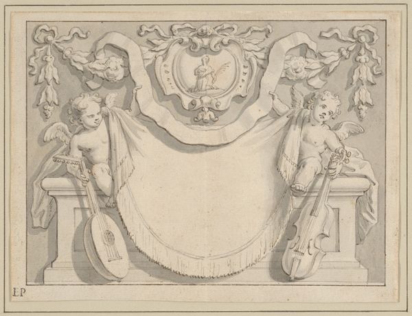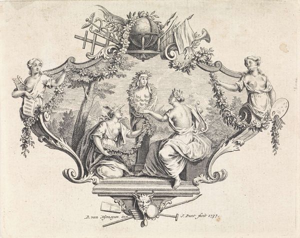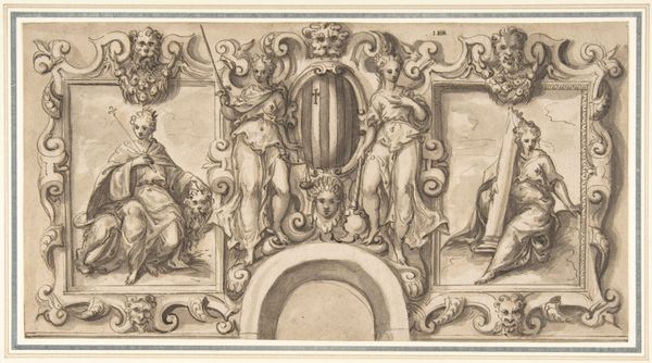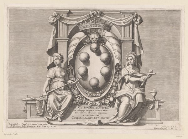 Pieter de Jode I created this engraving titled "Wapenschild met stier en vrouwelijke personificaties" sometime in the late 16th or early 17th century. Pieter de Jode was part of an artistic family in Antwerp, a city that was then a center of commerce and culture, but also deeply affected by religious and political conflict. This work, brimming with symbols, is a fascinating window into the period's values and ideals. On either side of the heraldic shield featuring a bull are female figures. One clutches lilies, embodying purity and innocence, while the other, with a helmet and spear, represents strength. These figures, seemingly straightforward representations of virtues, were in fact part of a complex debate about gender roles and ideals during the Renaissance. This piece encourages us to consider how power, virtue, and identity were constructed and negotiated through visual language. The bull on the shield might symbolize power, while the female figures beside it suggest the qualities needed to temper or control that power. It invites a dialogue about how we continue to grapple with these themes today.