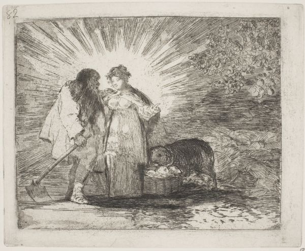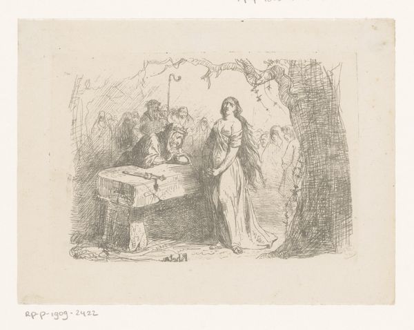 Editor: So, this print, "Vrouw komt bij een vleesverkoper in zijn kraam," created sometime between 1866 and 1910 by Louis van Engelen, depicts a woman at a butcher's stall. It’s remarkably detailed, especially considering it's an engraving. I’m struck by the almost staged encounter. What is your take on its significance? Curator: It's tempting to view it through the lens of social realism. These genre scenes were frequently used to either romanticize or critique daily life. How do you think the market stall, presented as a public, commercial space, reflects the socio-economic roles of women in that era? Editor: That’s a good question. Perhaps the woman represents the domestic sphere venturing into the commercial one, but what about the butcher holding what looks like a cigarette? Curator: Exactly! This nonchalant pose juxtaposes the expected diligence of labour with indulgence, offering social commentary. Are we seeing a critique of working-class habits? And look closer—what's hanging behind them? How does that imagery shape our perception of their social environment? Editor: I see, different birds and game animals; a sense of a life sustained by hunting and trade... but also display, maybe? This points to consumption patterns and how individuals like this butcher participated in those circuits. Would these prints have served an educational function, maybe influencing the views of a rising middle class? Curator: Potentially. Genre scenes served didactic functions and reveal evolving notions of class, labor, and gender. They are key to understanding visual culture's role in shaping social attitudes. Editor: This makes the scene far more than just an everyday interaction. Thinking about social messaging encoded in such images gives me a much better appreciation for the visual narratives circulating at that time. Curator: Precisely! It's a lens into the public imagination, the unspoken rules, and simmering tensions. Keep asking, keep looking!