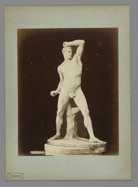 Editor: Here we have "Sculpture of Damoxenos, Vatican," made between 1857 and 1875. It’s currently held at the Rijksmuseum and seems to be crafted from marble. It depicts a nude male figure, classically rendered, but also feels… staged. How do you interpret this work, especially considering its historical context? Curator: The marble itself is a key point. Think about the quarrying, the labor involved in extracting and transporting that stone, then shaping it. The artist, James Anderson, through his photography, isn't just presenting a classical ideal. He's participating in a larger industry that commodifies and circulates these images. This circulation reinforces certain notions about beauty, masculinity, and power, doesn't it? Editor: So it's not just about the ideal form, but about the process that creates and disseminates that ideal? The labor behind the photograph is often invisible. Curator: Exactly. Consider the staging, the props - even the "classical" tree trunk provides support. What's supporting what, physically and metaphorically? And how does this image become a product itself, available for consumption and replication? It makes you question, doesn’t it, the very idea of a singular, 'original' artwork. Editor: I never really thought of the circulation of images that way, as reinforcing specific ideas. It opens a new perspective on the social role and responsibility of photography in museums. Thank you! Curator: Indeed. Considering these processes behind the artwork makes one see how art becomes implicated in power structures. It's something to consider further!