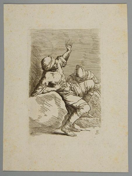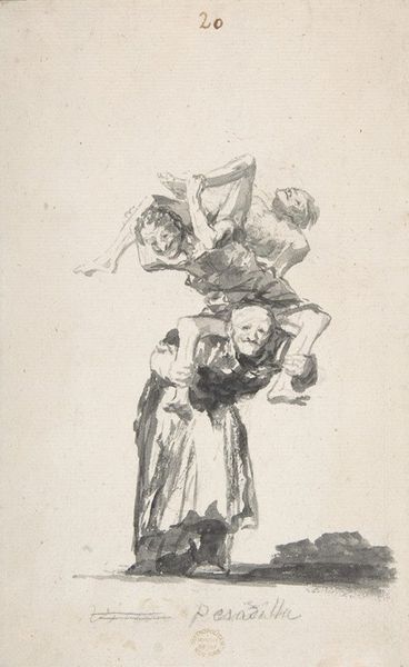 Curator: Here we have a drawing by Francisco Goya, dating from around 1816 to 1820. The inscription at the bottom reads, "You'll See Later"… and we indeed see a narrative playing out before our eyes. Editor: The scene feels frantic and charged, doesn't it? The starkness of the pencil strokes adds to that raw energy. A man, caught mid-drink, struggles against the woman trying to wrestle the jug from him. Curator: Precisely. The political and social upheavals of the time—Spain was in turmoil—certainly impacted Goya's perspective. What he presents isn't just a simple genre scene; it is imbued with potential consequences of indulging one's vices. Editor: It strikes me as a powerful indictment of addiction. The woman’s desperation is palpable; her gesture is both loving and forceful. I am wondering if we can view this domestic drama through the lens of gender and class? Curator: Yes, I find myself wondering what this intimate moment suggests about larger societal structures, especially considering the restrictive roles assigned to women at the time. Goya does show women's struggle within marriage frequently. Editor: Absolutely. I mean, who holds power, and who is subjected? Her frantic grip versus his refusal to yield – it speaks volumes beyond just a man having a drink. What implications this holds, right? Goya does ask powerful questions, questions about social ills. Curator: True. Goya offers a complex view here, reflecting the anxieties of post-war Spain under a restored monarchy, one that restricted personal freedoms. What does public restraint reflect in people's private lives? Editor: Ultimately, for me, the emotional core resonates most. That raw depiction of struggle against something larger than oneself; Goya really understood human frailty and rendered it with unflinching honesty. It forces the viewer to reflect on human cost. Curator: Indeed. Goya captures this battle beautifully in just a few strokes, but it really carries much larger and complex ideas on morality, agency, and the burdens we carry as individuals and societies.