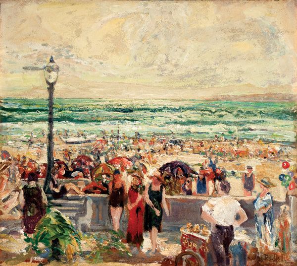 Leonid Muchnyk created this painting, simply titled 'City Sketch,' using oil paints on canvas. The figures, captured in various states of leisure, seem to converge towards the water's edge, an area often symbolically associated with the subconscious or the threshold of the unknown. The recurring motif of the crowd—seen throughout art history from ancient Roman gatherings to Impressionist boulevard scenes— speaks to our inherent human need for communal experience and shared identity. Notice that in other examples, the crowd also serves to mask individual emotion and experience. Like the ebb and flow of tides, these gatherings resurface across time and cultures. It's a powerful force that engages viewers on a deep, subconscious level as it taps into the collective memory of human interaction and shared experiences.